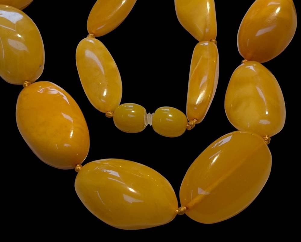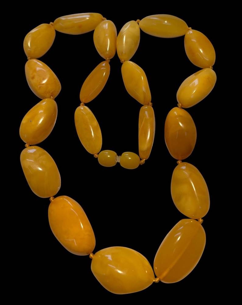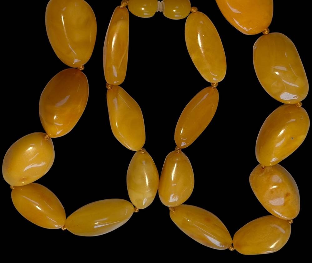 Halskette mit gelben, olivenförmigen Bernstein,verluafend, L-ca. 50 cm, 33,3 gr. [1]