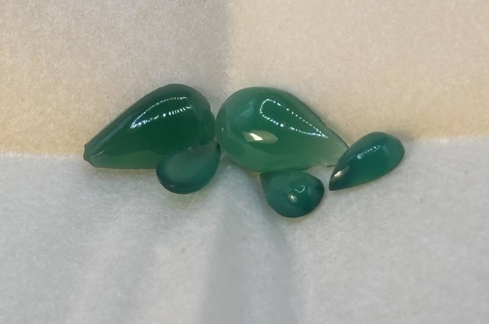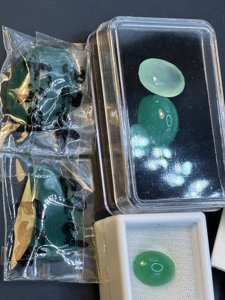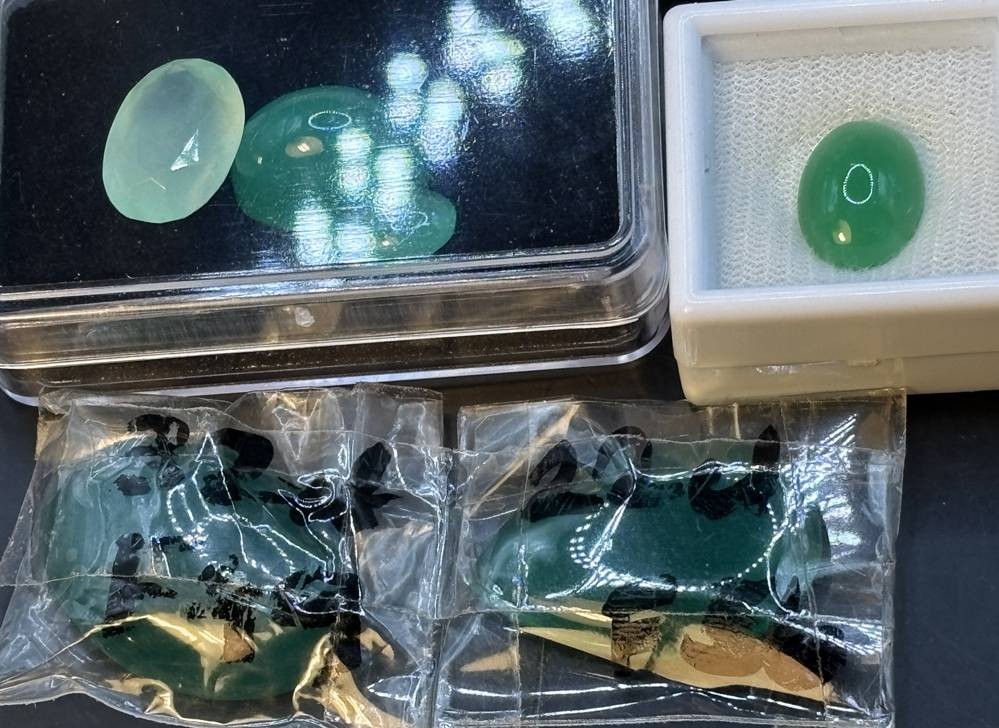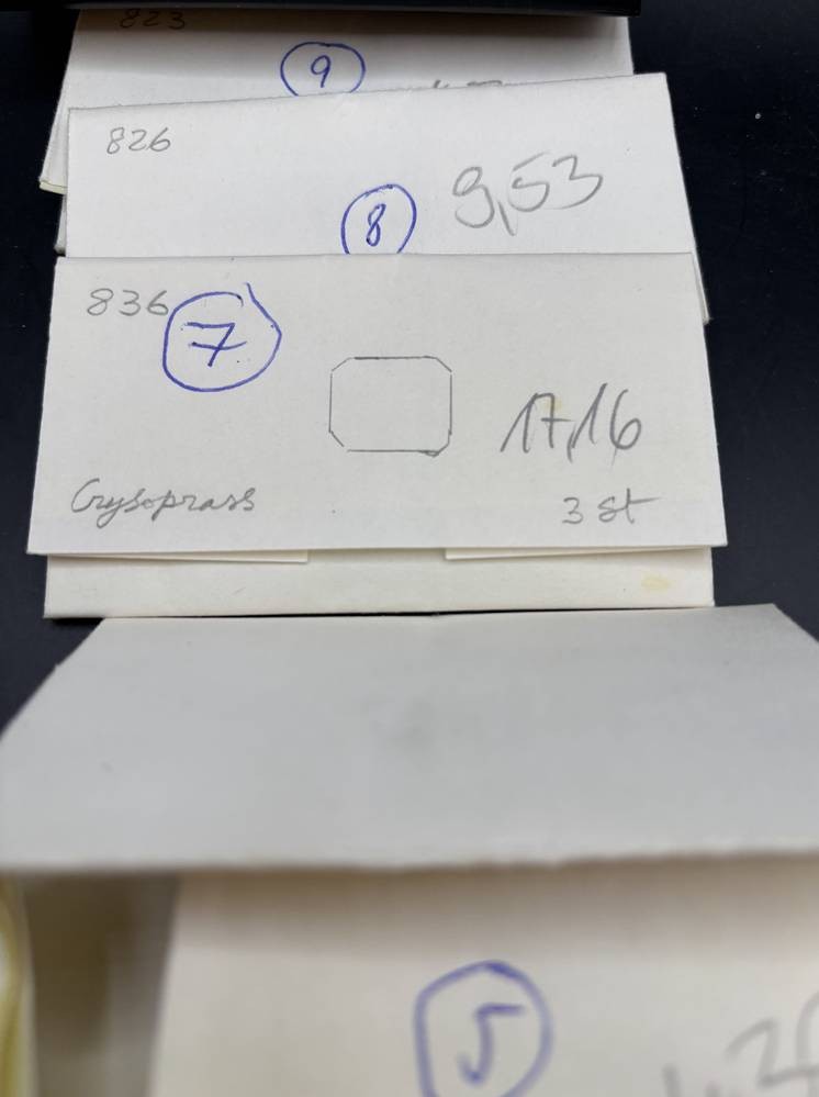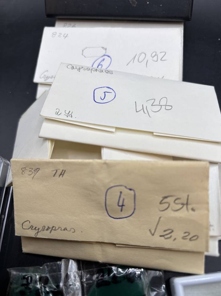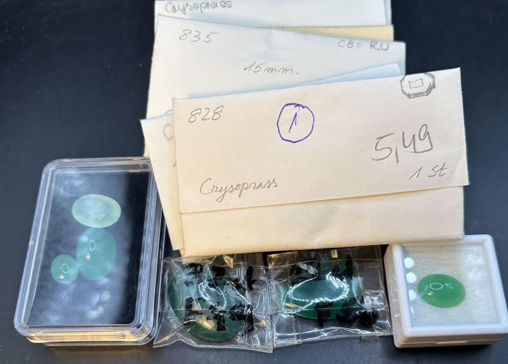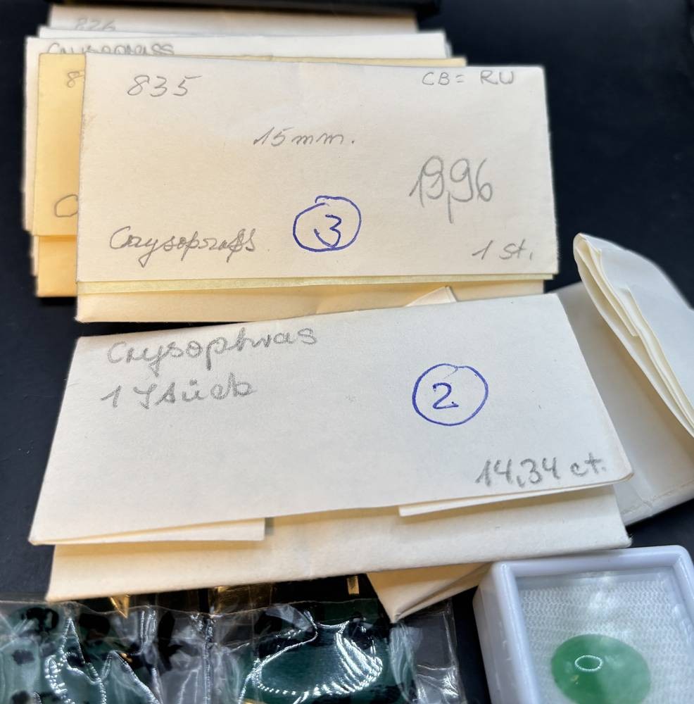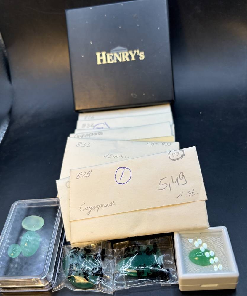 Karton von "Henry" Auktionshaus mit 12 Tüten Chrysopras, wohl weit über 120 ct, Falt-Tüten mit Grösse etc. fachmännisch beschriftet, anbei 2 Seiten, da der Tüteninhalt gelistet und Qualität fachmännisch beschrieben, anbei einige grosse lose Chrysoprase [1]