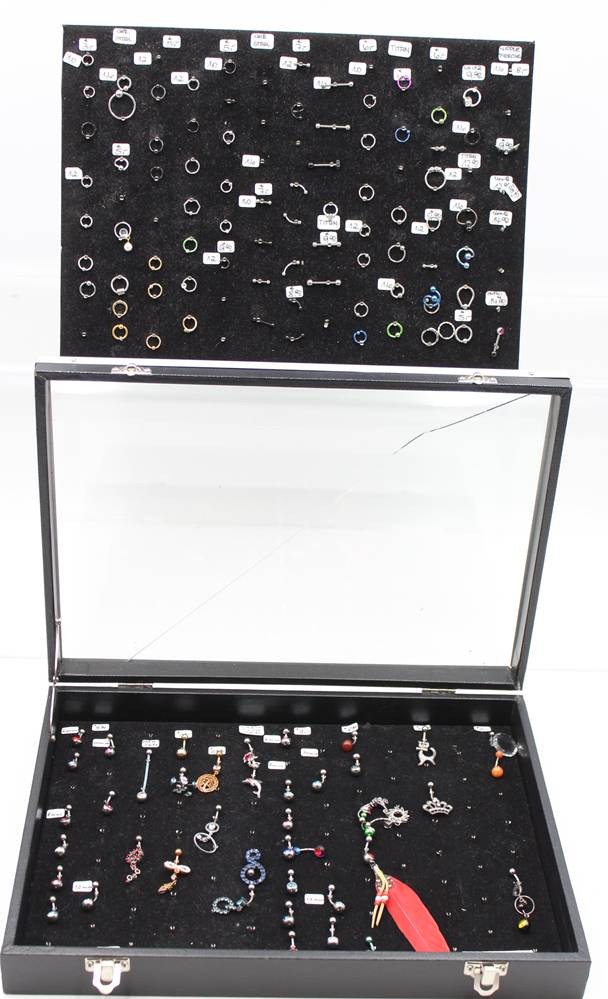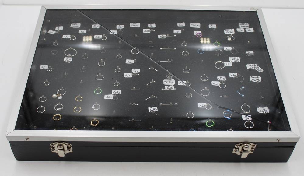 Kasten mit div. Piercings, Edelstahl, Titan u. einige wohl Silber