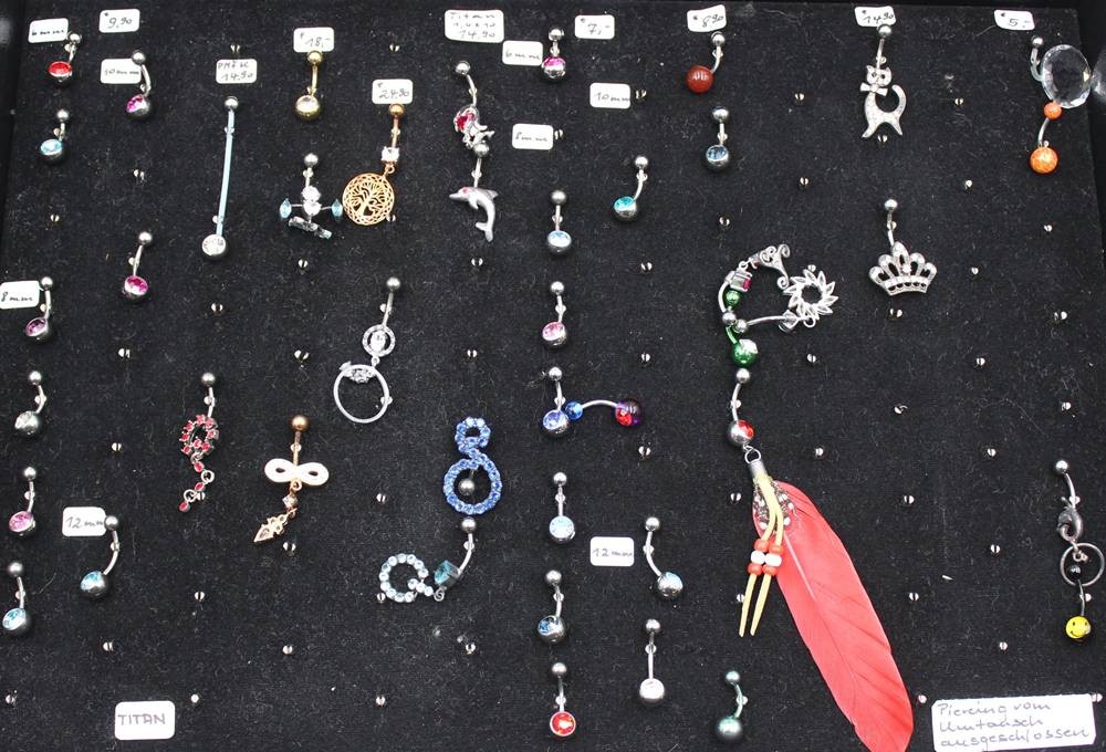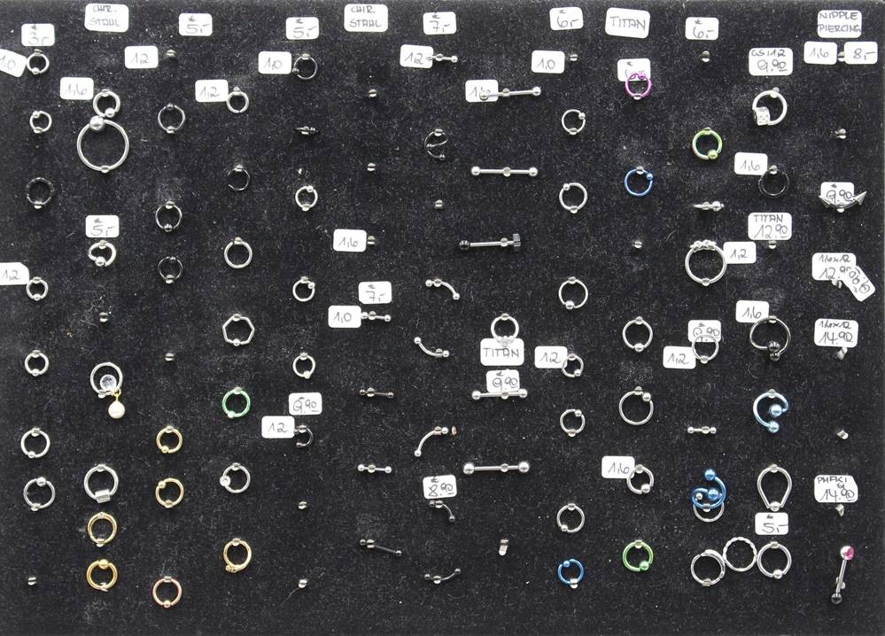 Kasten mit div. Piercings, Edelstahl, Titan u. einige wohl Silber [1]
