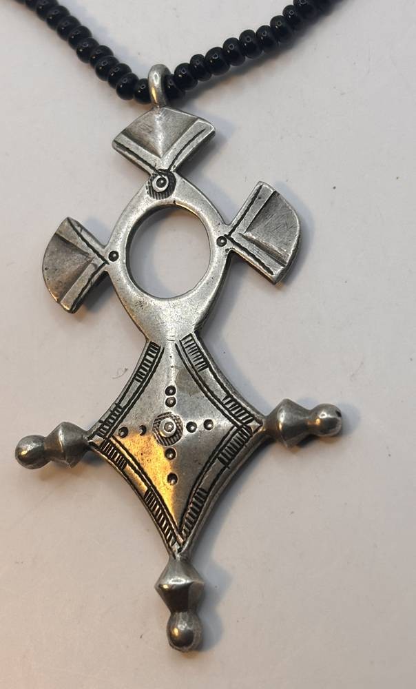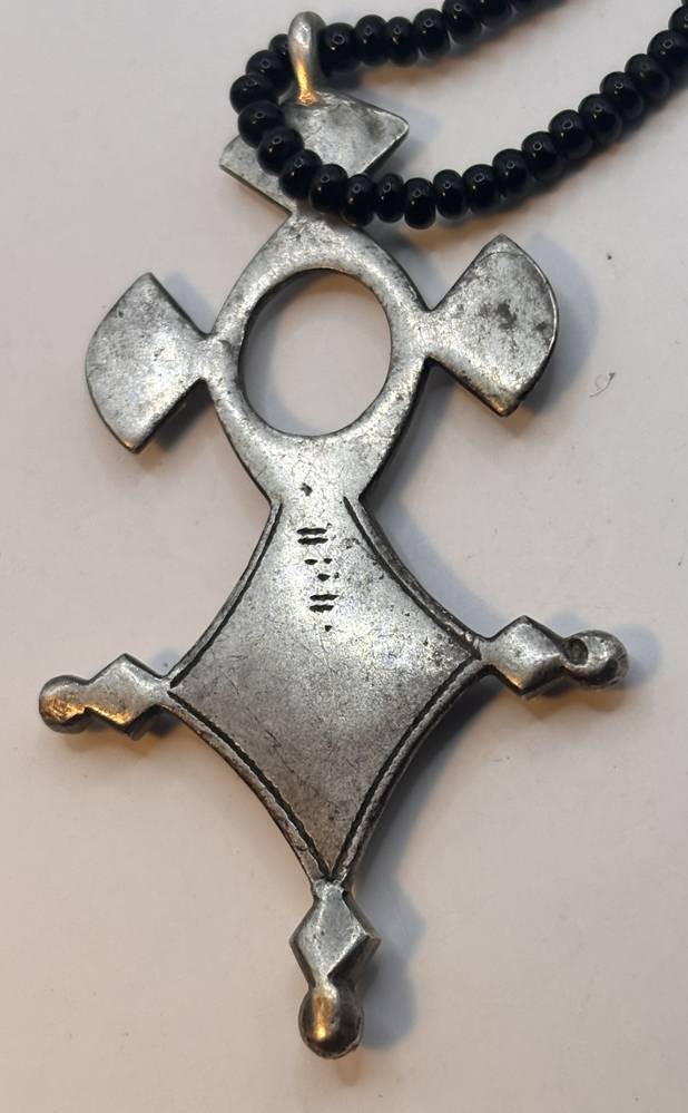 kl. Tuareg Kreuz, Silber an Glasperlenkette (ohne Schliesse), älter, Kreuz 10 gr., H-5 cm [1]