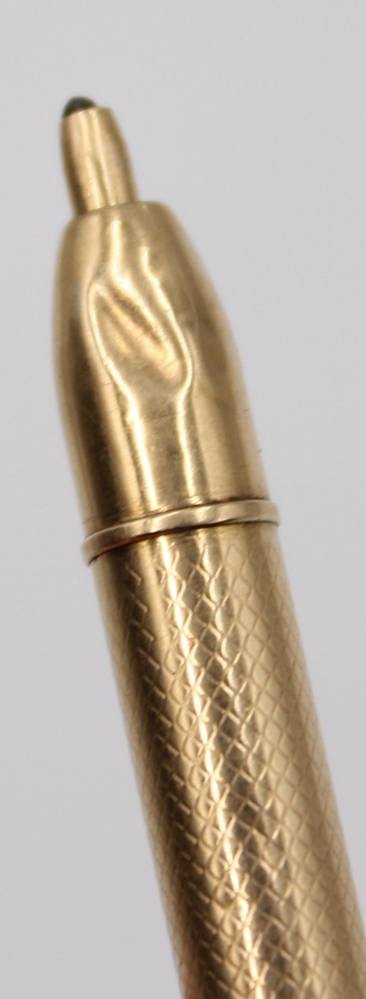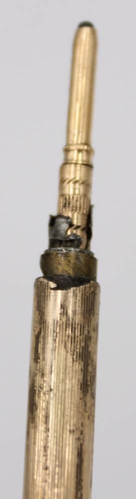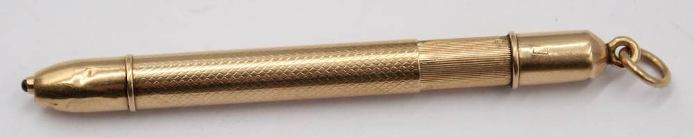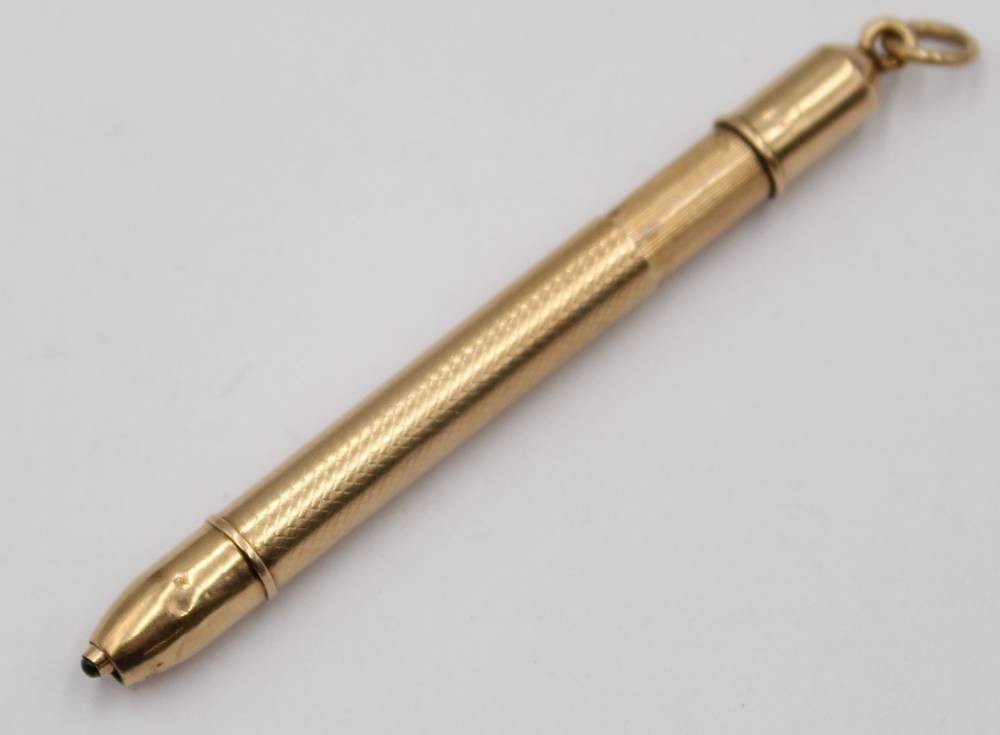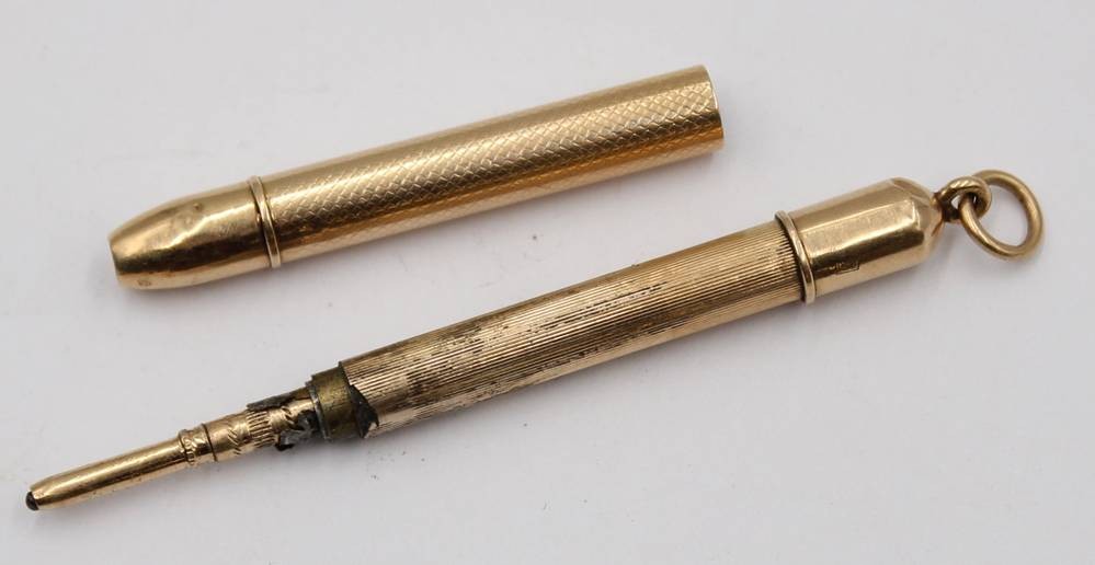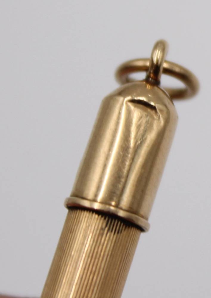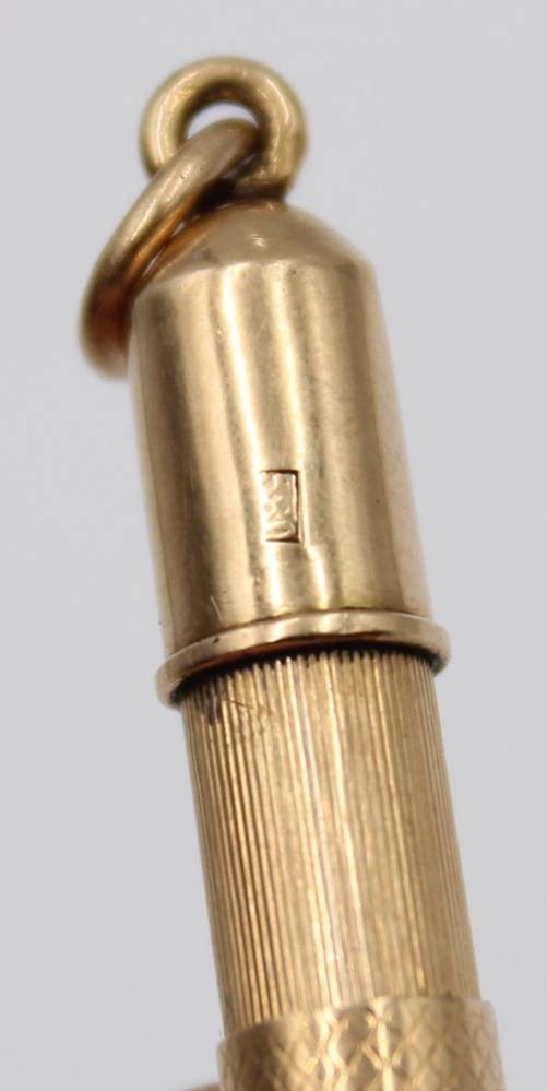 kl. Umhänge-Drehbleistift, Gold -580- gestempelt?, geprüft, , 7,3 gr., L-7 cm, Delle [1]