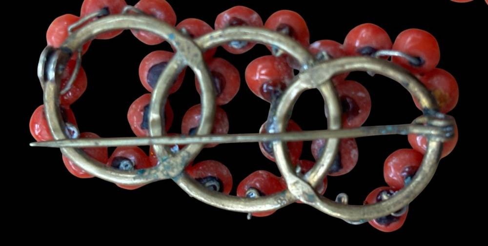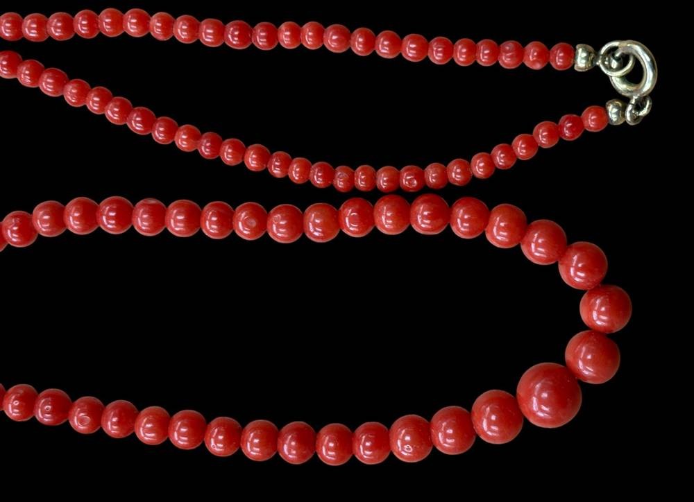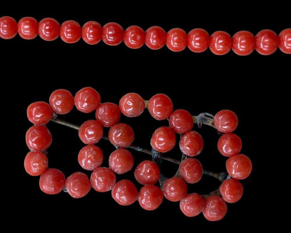 Korallen-Kette und Brosche, Kette verlaufend, bei Brosche fehlt eine Kugel, B-4,5 cm , Kette-60 cm, [1]