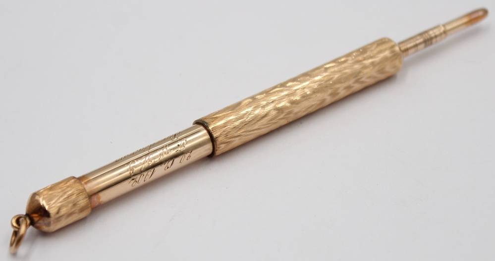 kurzer Drehbleistift mit Öse, Gold-585-. Gravur 20.12.1902,für F.W.H.G. BruckmeyerL-ca. 7,5 cm, 23,3 gr. [1]
