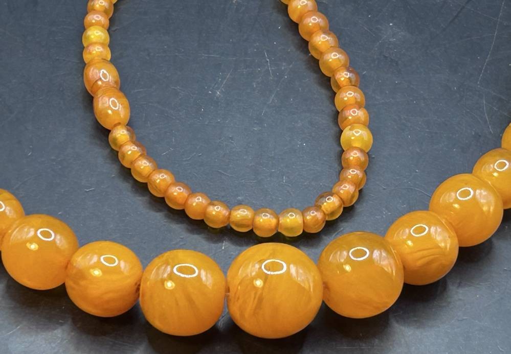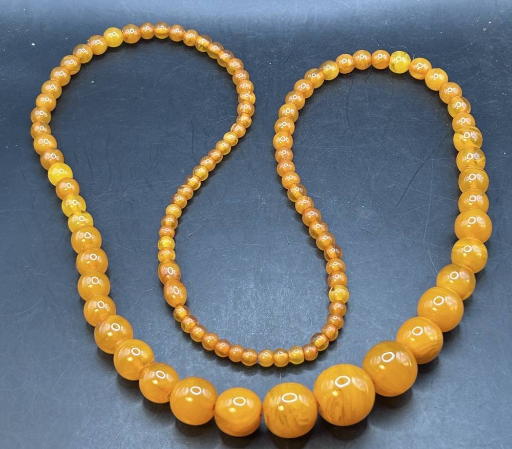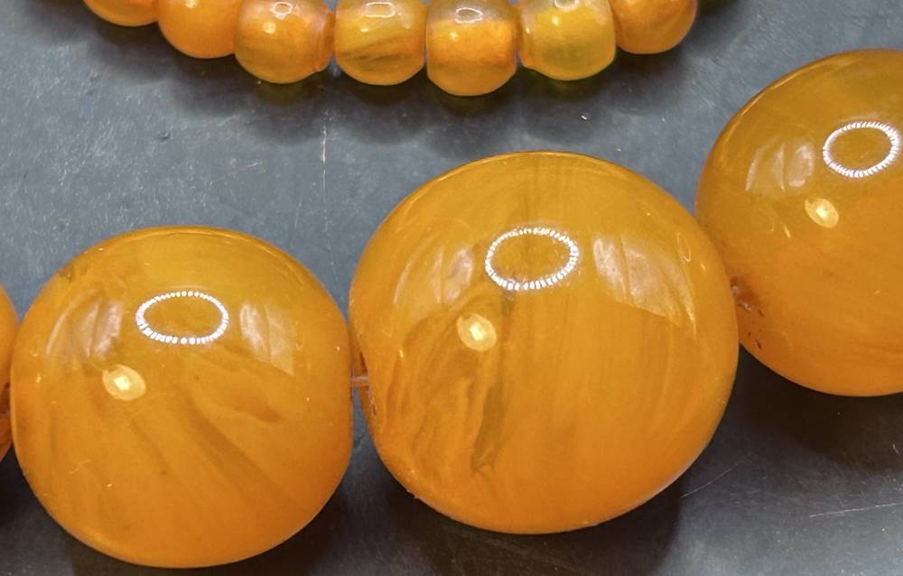 lange Bernstein Imitat/Bakelit Halskette, grosse Kugeln verlaufend, grösste D-1,5 cm, L-ca. 80 cm [1]