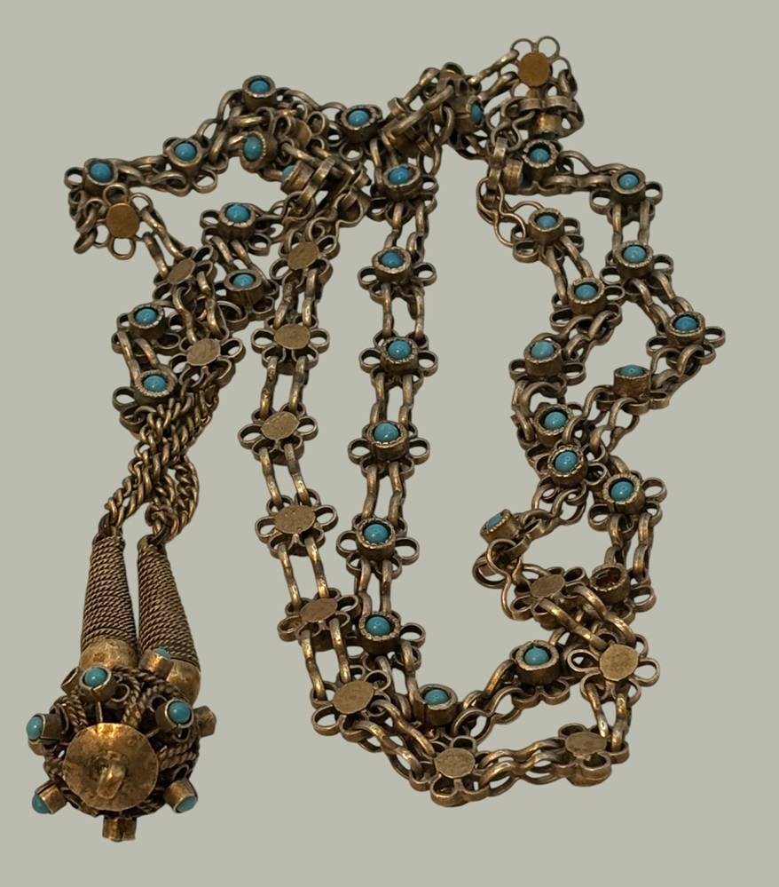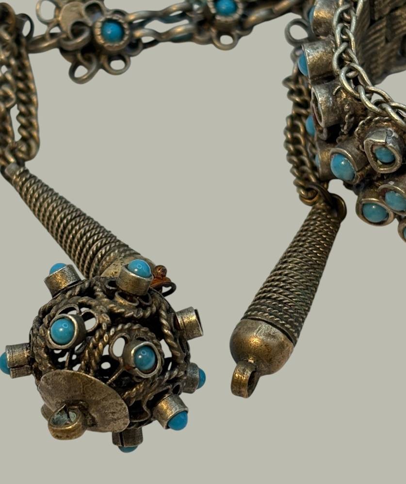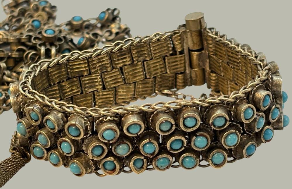 massives versilbertes Armband und lange Kette, blaue Steine, Afghanistan?, zusammen 198,3 gramm, Armband B-2 cm, Kette L-ca. 102 cm, bei beiden fehlt je ein Steinchen [1]
