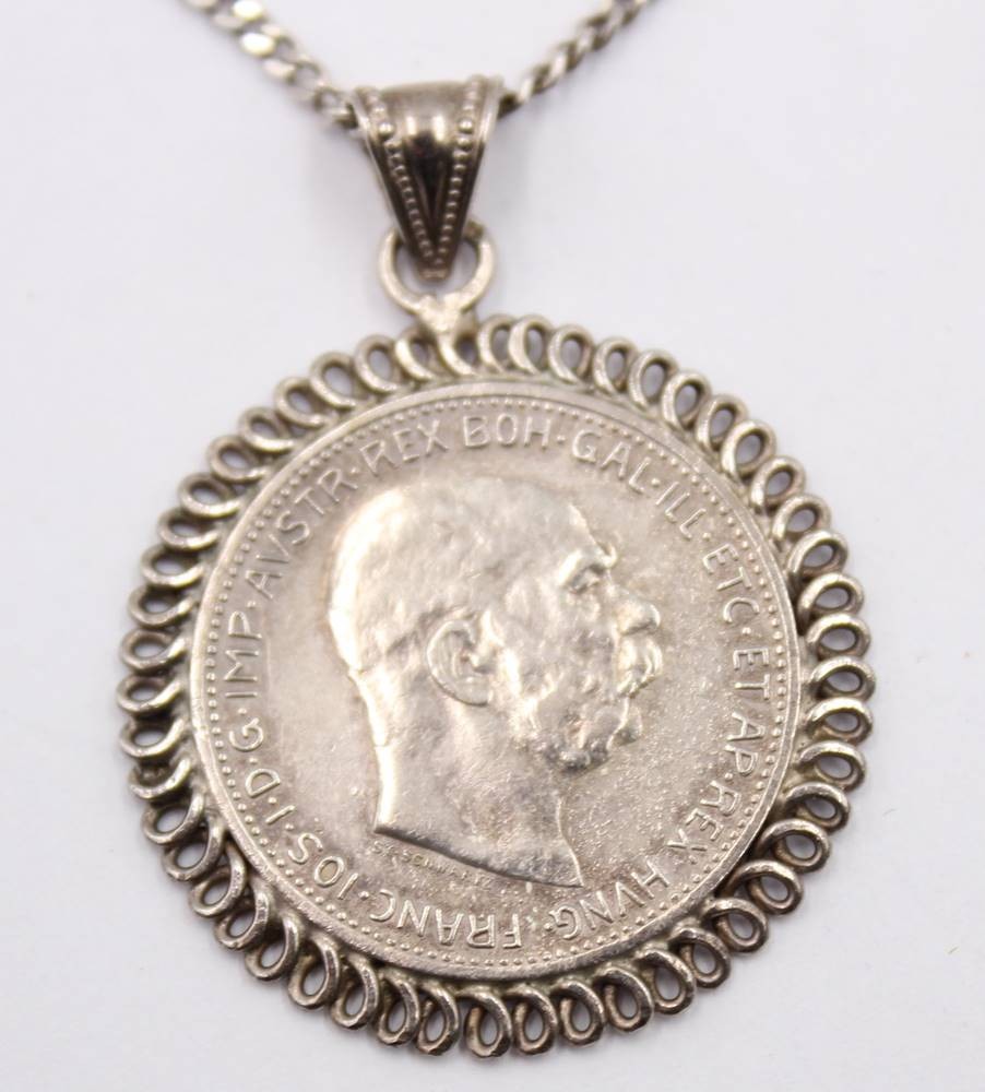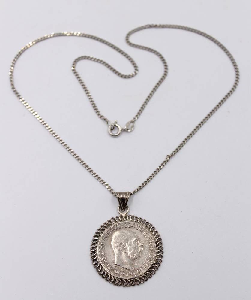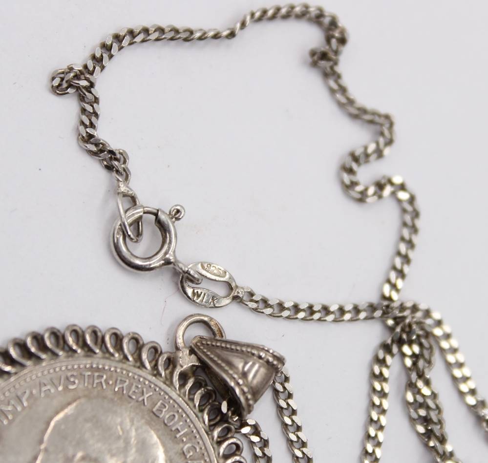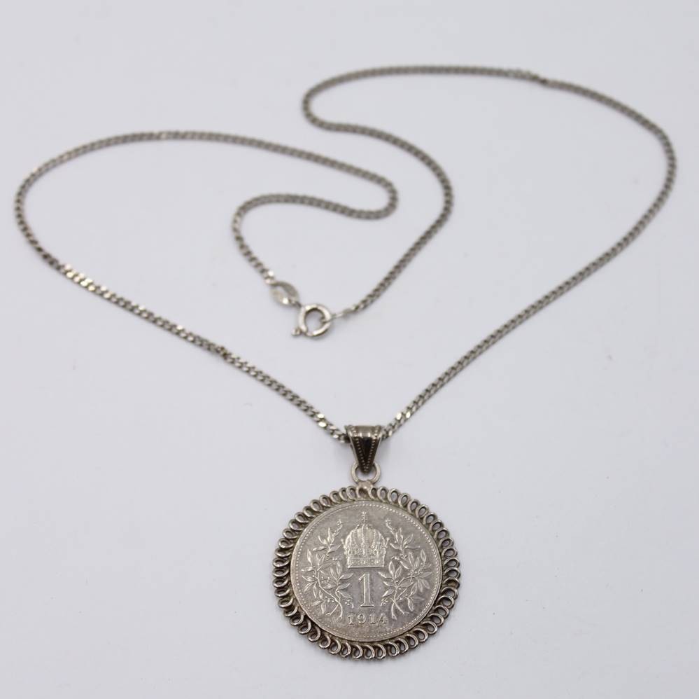 Münzanhänger in Silberfassung, 1 Krone Österreich 1914 an 925er Kette, L-42cm, Anh. ca. 3,8cm [1]