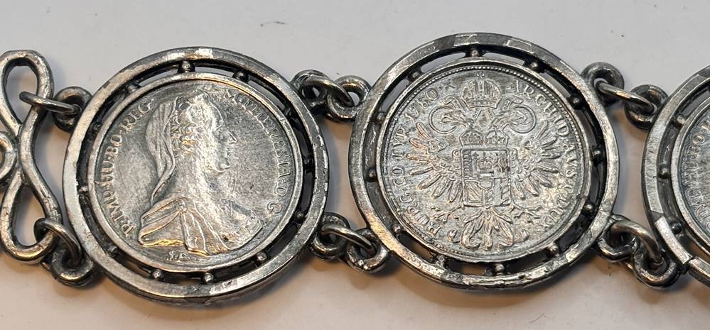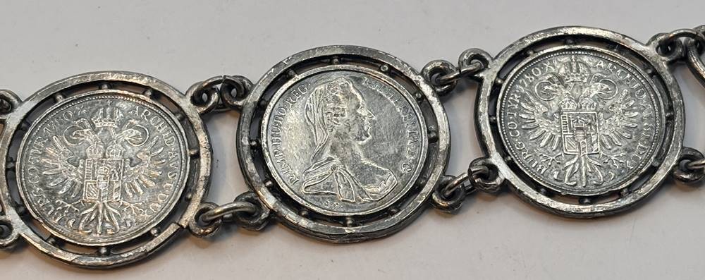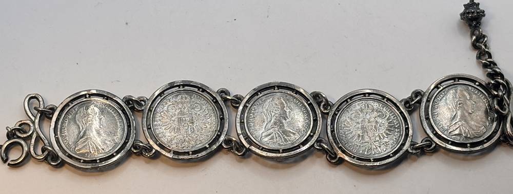 Münzarmband mit 5 kl. Maria Theresientalern, diese wohl kein Silber, Armband und Münzhalter eventuell lt. Säuretest Silber ??, aber ungemarkt, L-ca. 20 cm, ca. 52 gr