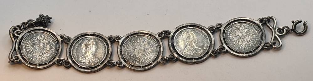 Münzarmband mit 5 kl. Maria Theresientalern, diese wohl kein Silber, Armband und Münzhalter eventuell lt. Säuretest Silber ??, aber ungemarkt, L-ca. 20 cm, ca. 52 gr [1]