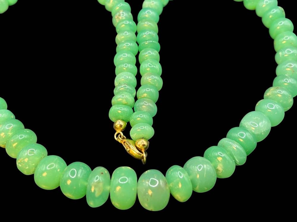 Natürliche Chrysopras-Halskette, grün in ausgezeichneter Qualität mit Goldschliesse-375-. verlaufend,glatte Rondelle, grösster ca. D-11.8 mm bis 7.4 mm , L-46 cm, 55,4 gr. [1]