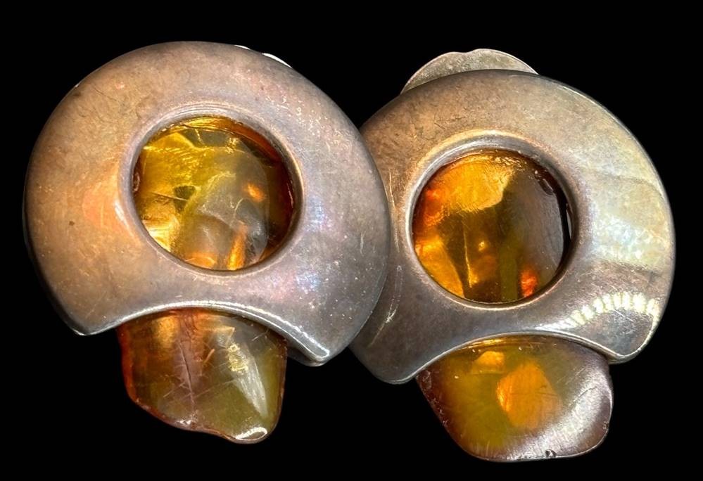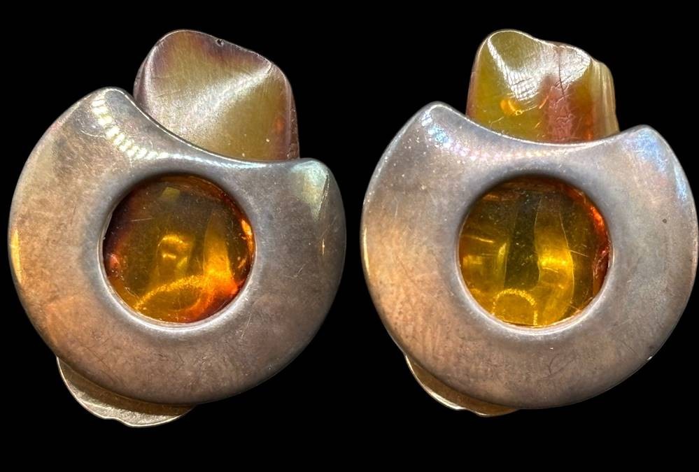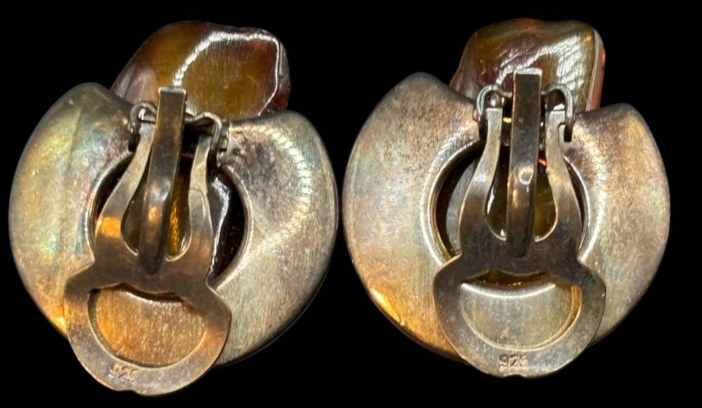 Paar massive Ohrclips Silber-925- mit Bernstein-Blättchen, zus. ca. 14 gr., B-2,2 cm [1]