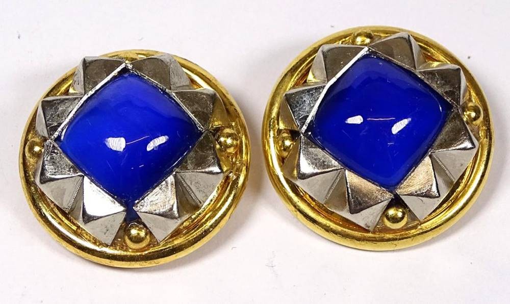 Paar runde Ohrclips,blaue Steine,d-3,7cm,Alters-u. Gebrauchsspuren
