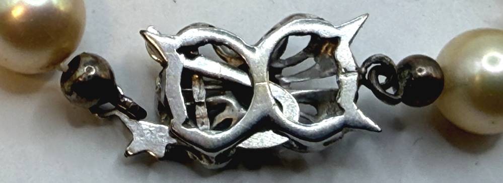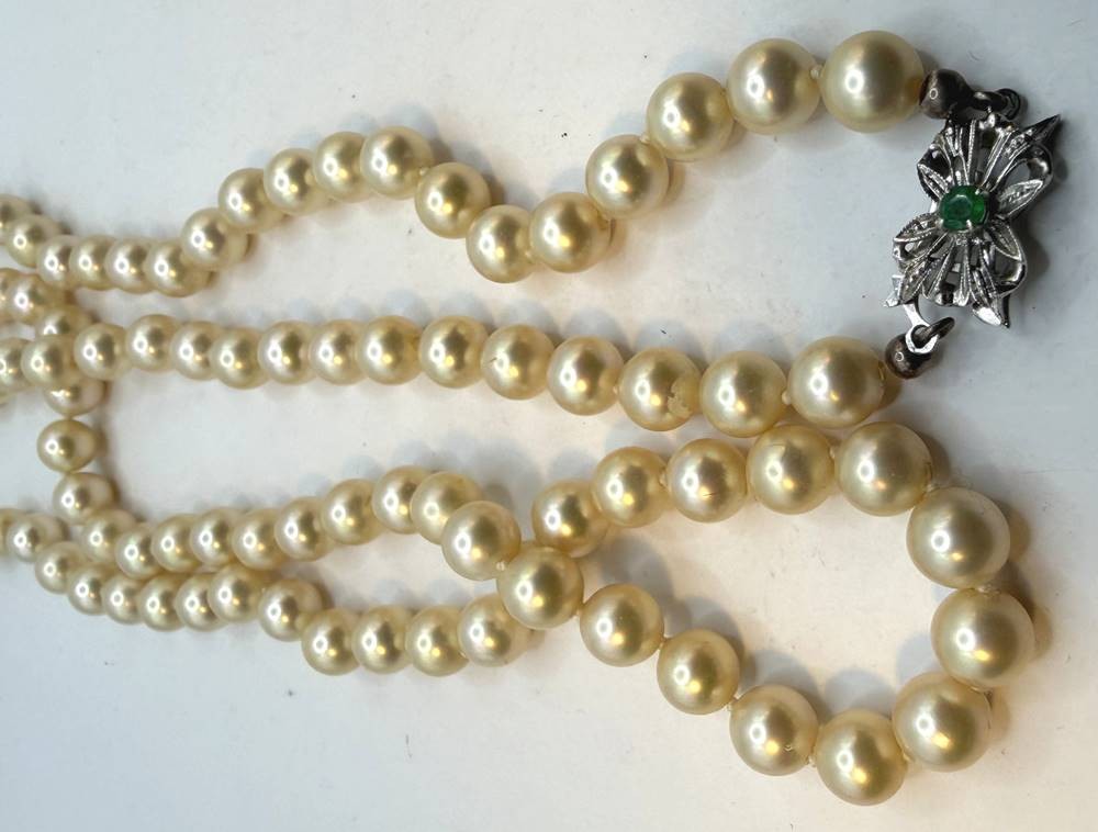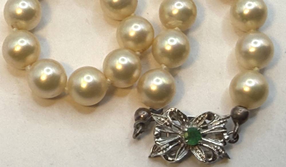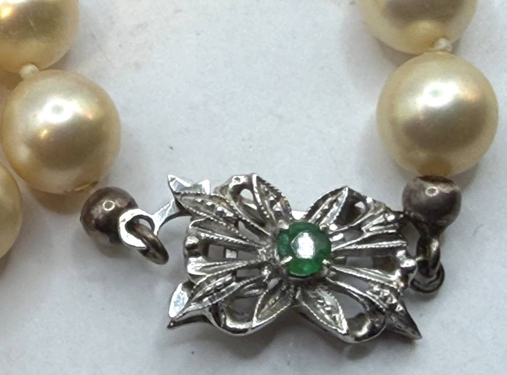 Perlenkette mit WG Verschluss 750/000, mittig rund facc. Smaragd, Kette L. 78cm, Perlen D. 7,1 mm, [1]