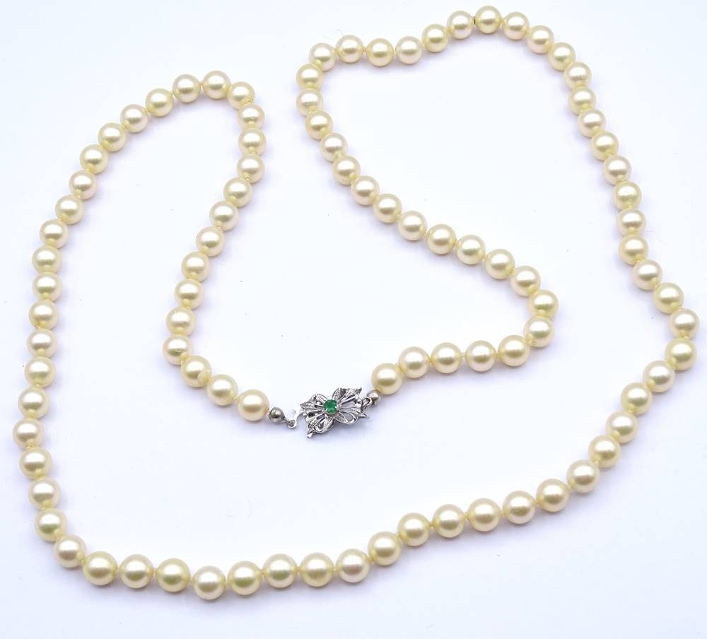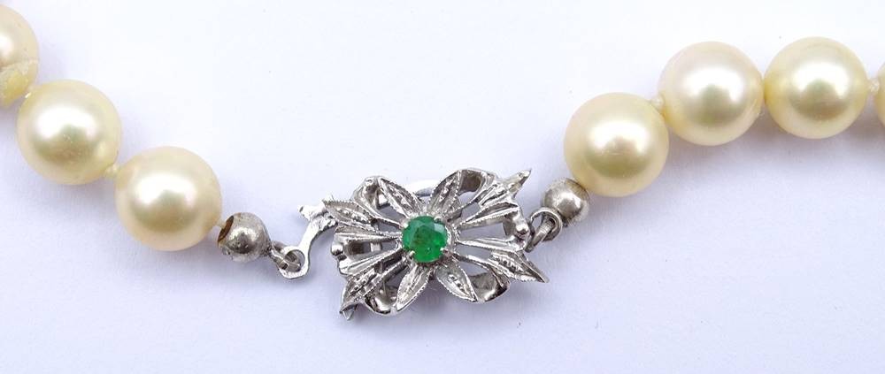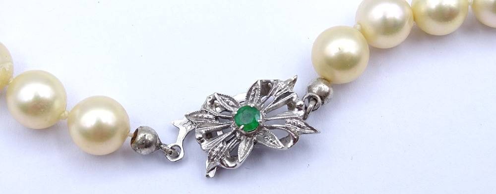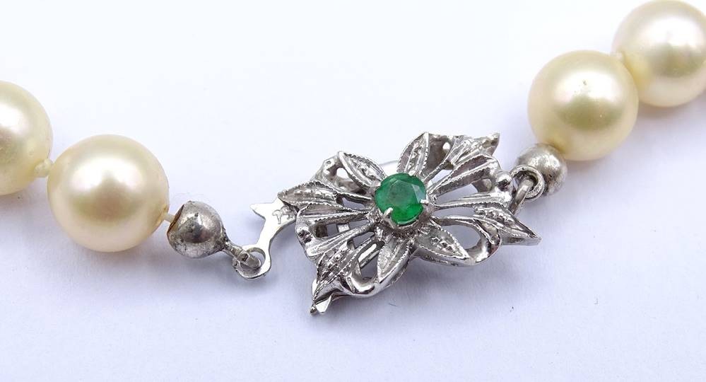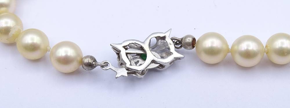 Perlenkette mit WG Verschluss 750/000, mittig rund facc. Smaragd, Kette L. 78cm, Perlen D. 7,1mm [1]
