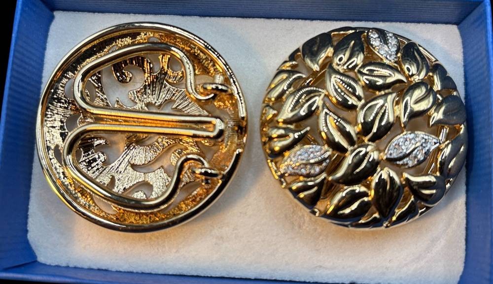 Pierre Lang, 2x Tuchclip, vergoldet, 1x mit klaren Steinen, neuwertig in OVP, D-ca. 4,2cm [1]