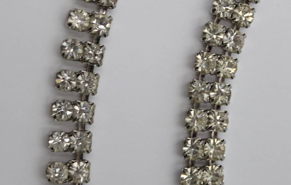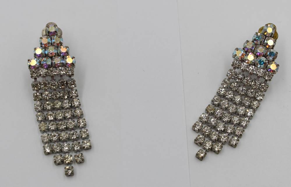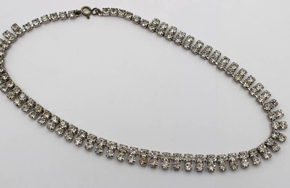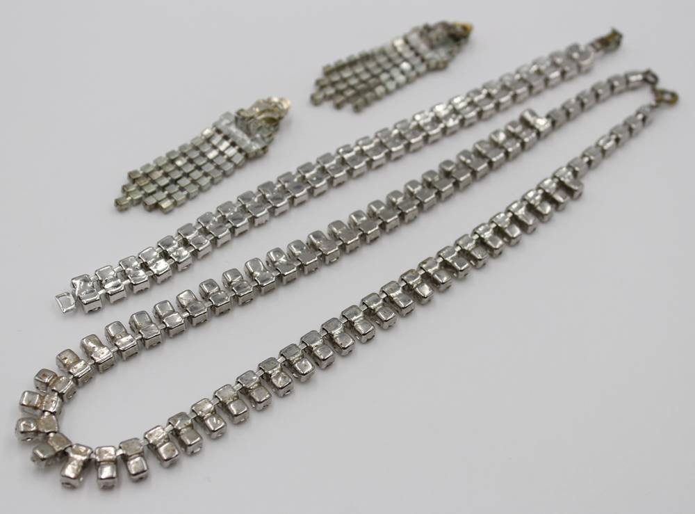 Schmuckset, älter, Strass, Ohrclipse, Armband und Kette, ca. L-5,5cm, L-17,5cm u. L-41cm [1]