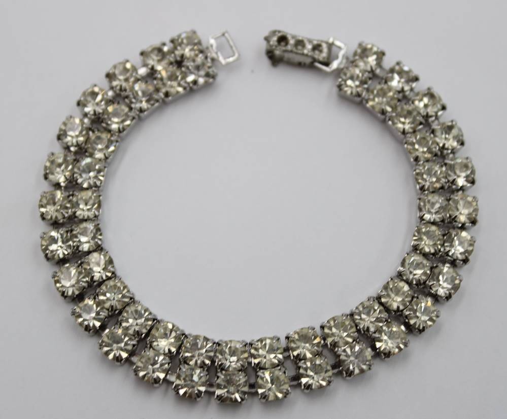 Schmuckset, älter, Strass, Ohrclipse, Armband und Kette, ca. L-5,5cm, L-17,5cm u. L-41cm