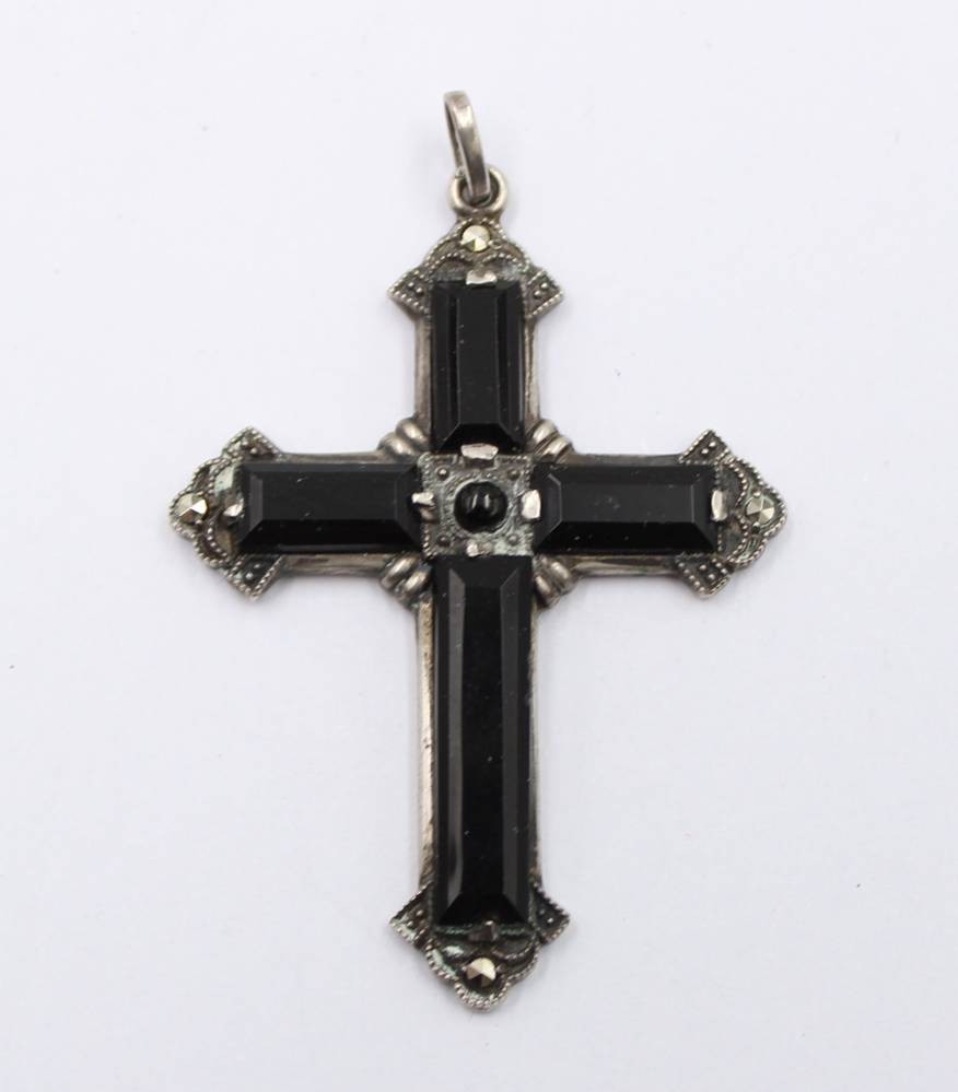 schöner Kreuzanhänger, Silber, Onyx und Markasiten, ca. 4,5 x 3cm [1]