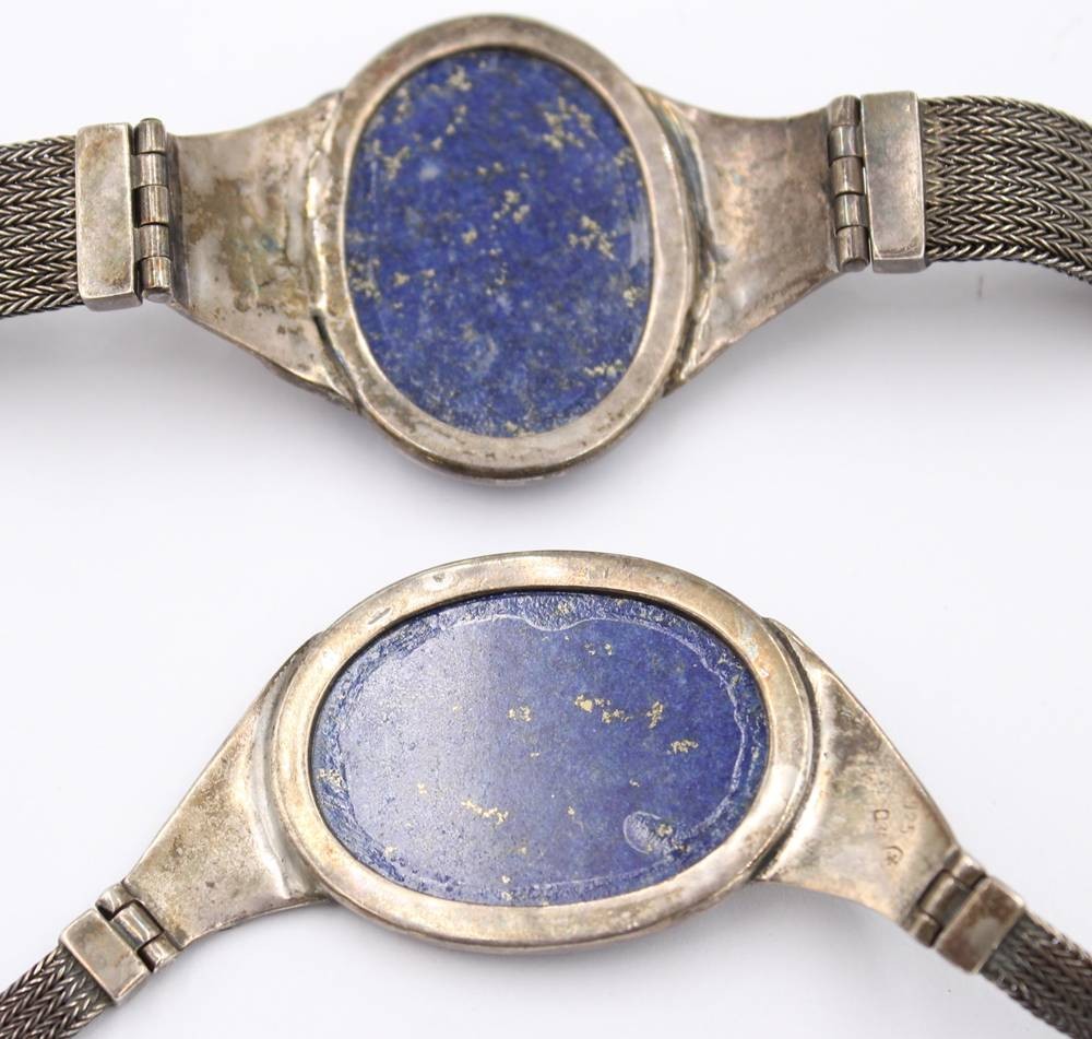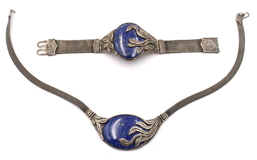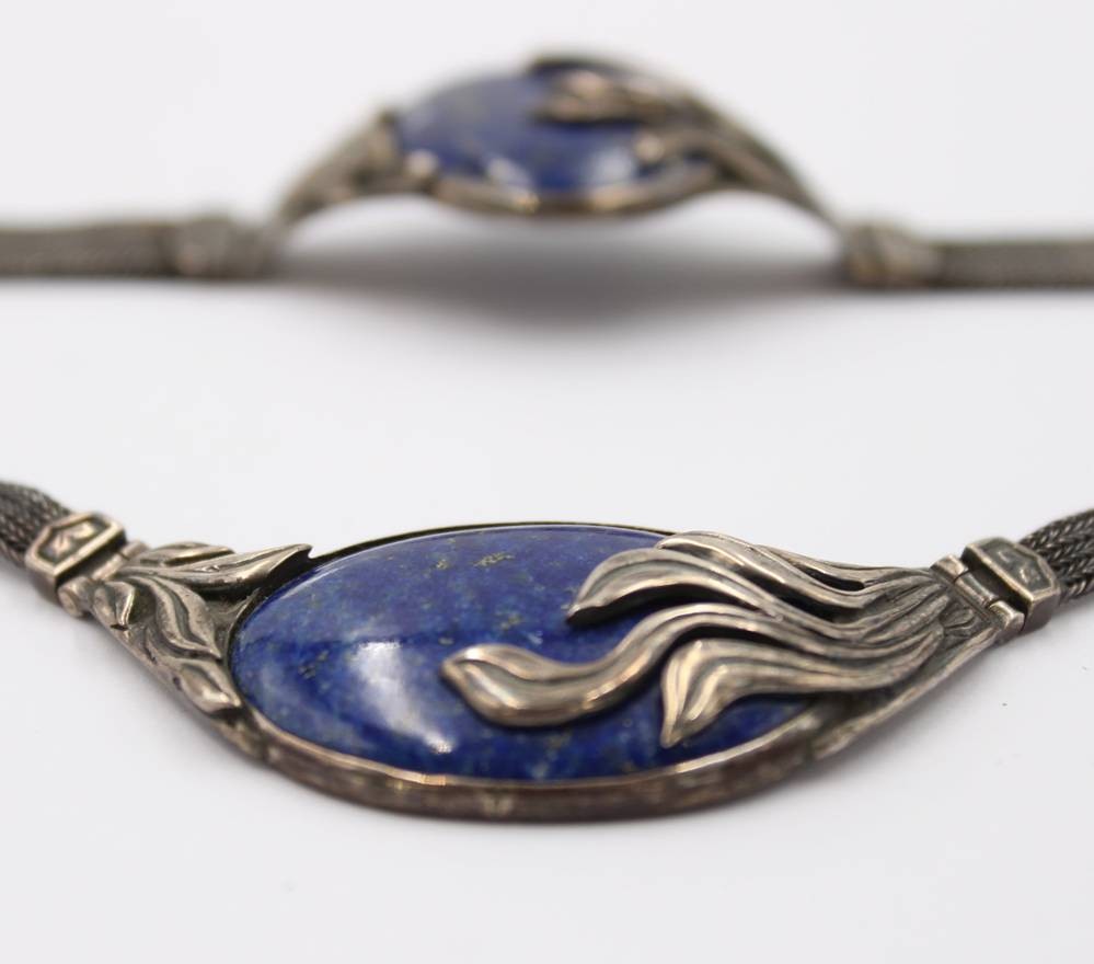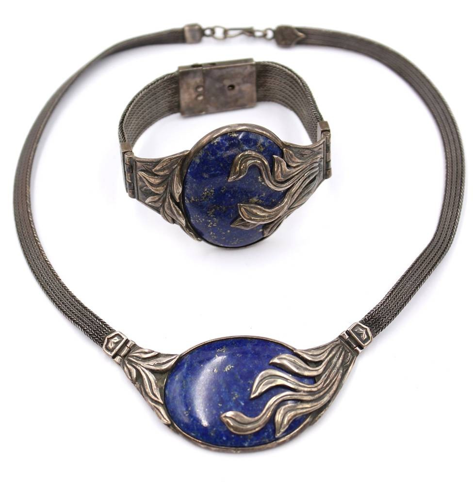 schönes Silberset, älter, 925er Silber, mit gr. Lapislazuli, Collier und Armband, zus ca. 93,4gr., L-35cm, und L-17cm [1]