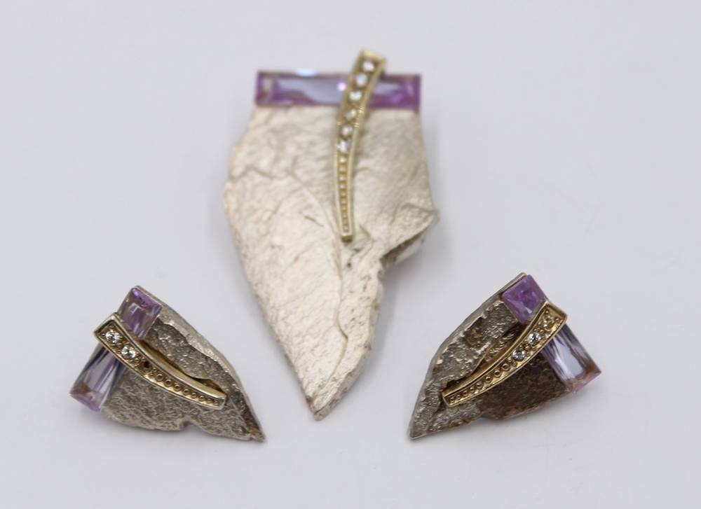 Set, 925er Silber, Ries, Anhänger und Ohrstecker, lila und klare Steine, bei Steckern fehlt ein klarer Stein, zus. ca. 25gr., L-5cm und 2,3cm [1]