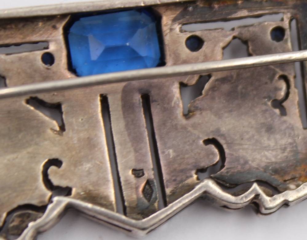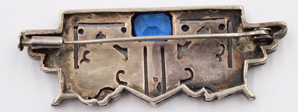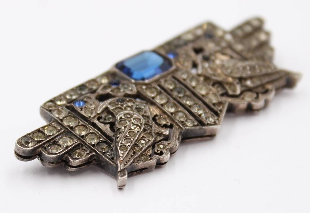 Silber Art-deco Brosche mit blauem Centerstein und gelblichen Strasssteinen ( 1x Fehlt ) [1]