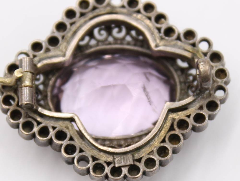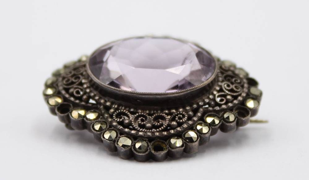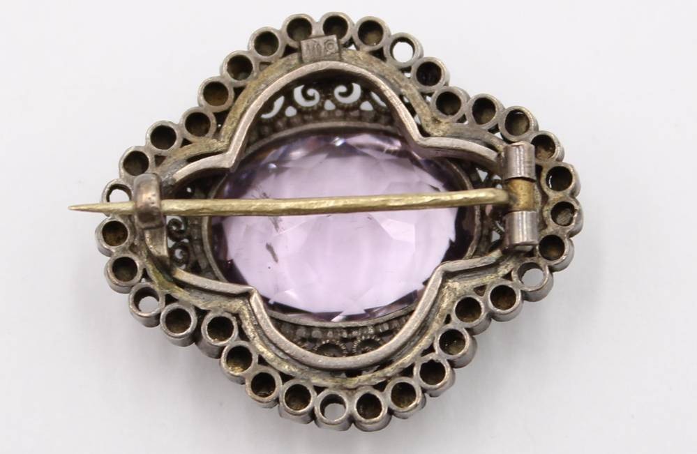 Silber-Brosche um 1920, Amethyst und Markasitenbesatz (einge fehlen), ca. 9,6gr., ca. 3 x 3cm [1]