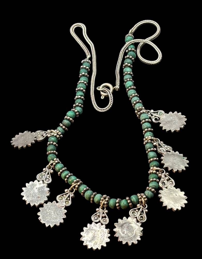 Silber Collier mit Malachit, geprüft, L-ca. 45 cm, 30,1 gr., um 1900?