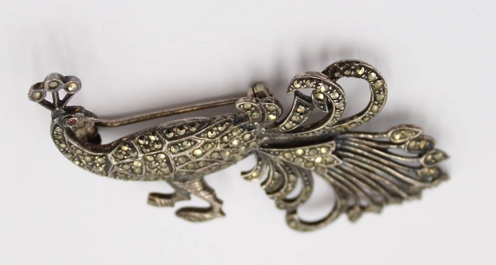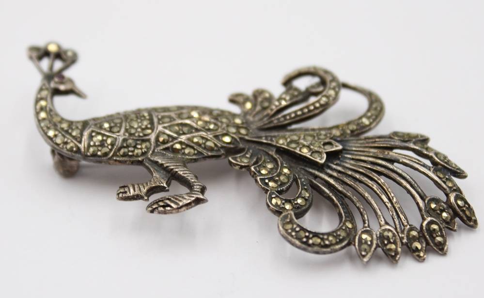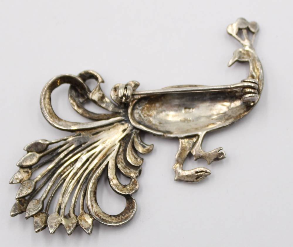 Silberbrosche-925- mit Markasiten "Pfau", L-6,3 cm, 9,9 gr [1]