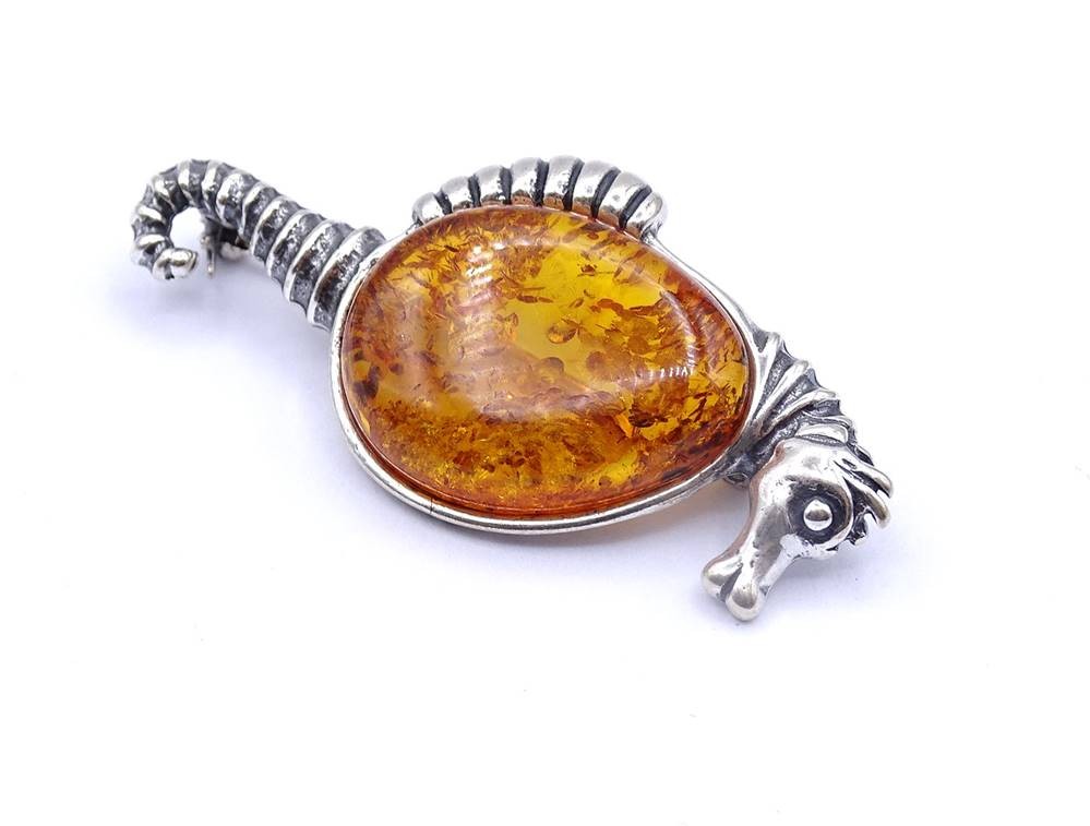 Silberbrosche in Form eines Seepferdchen mit Bernstein Cabochon, Silberfassung 925/000, L. 4,9cm, 8,5g. [1]