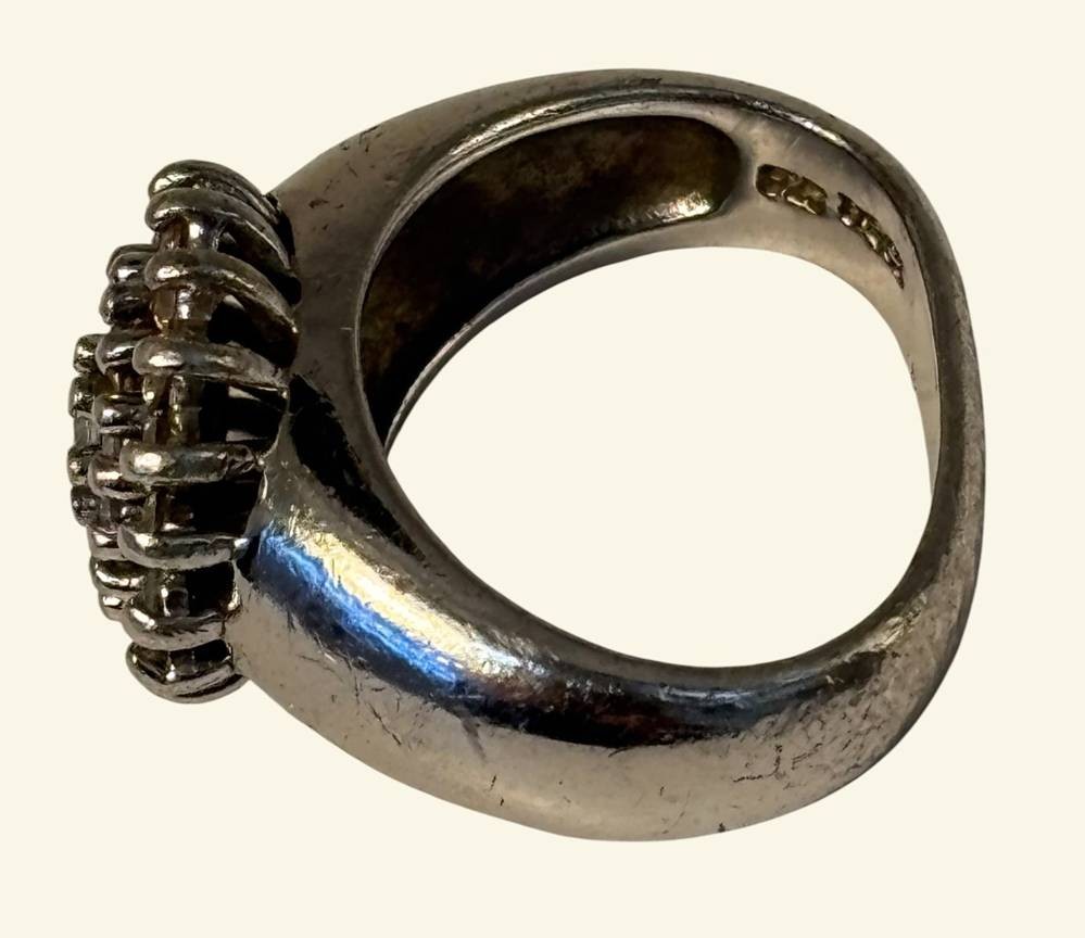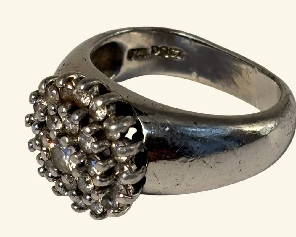 Silberring-925- mit klaren Steinen, Schiene verbogen, RG daher z.Zt. nur 50 (wohl deswegen), 7,7 gr [1]