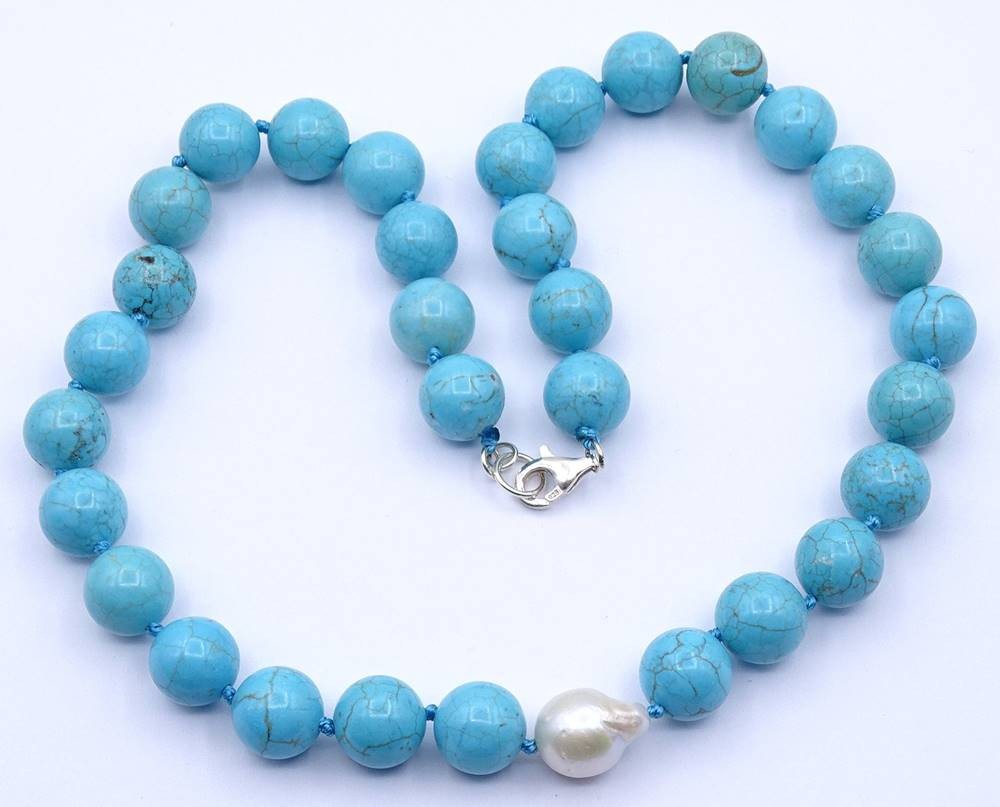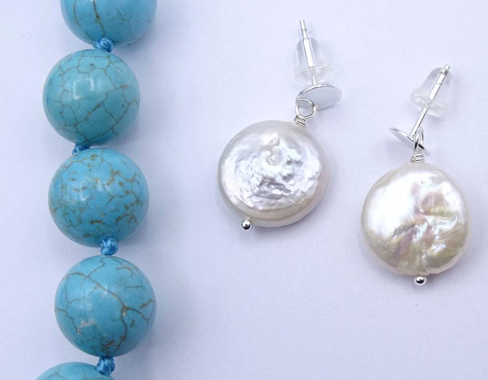 türkisfarbene Halskette + Ohrringe,Kette mit Sterlingsilber Karabiner und Barockperle, Kette L. 49,5cm [1]