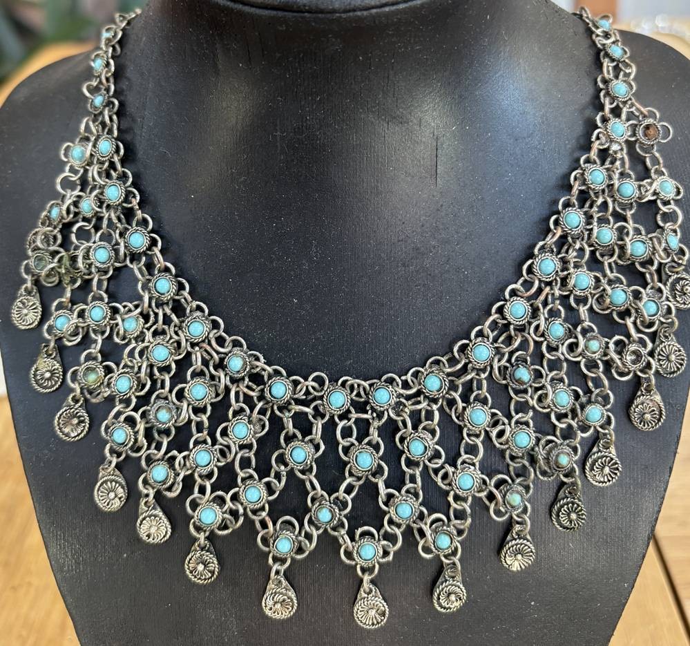 versilbertes Ethno-Collier mit Türkisen, L-45 cm, 43,6 gr