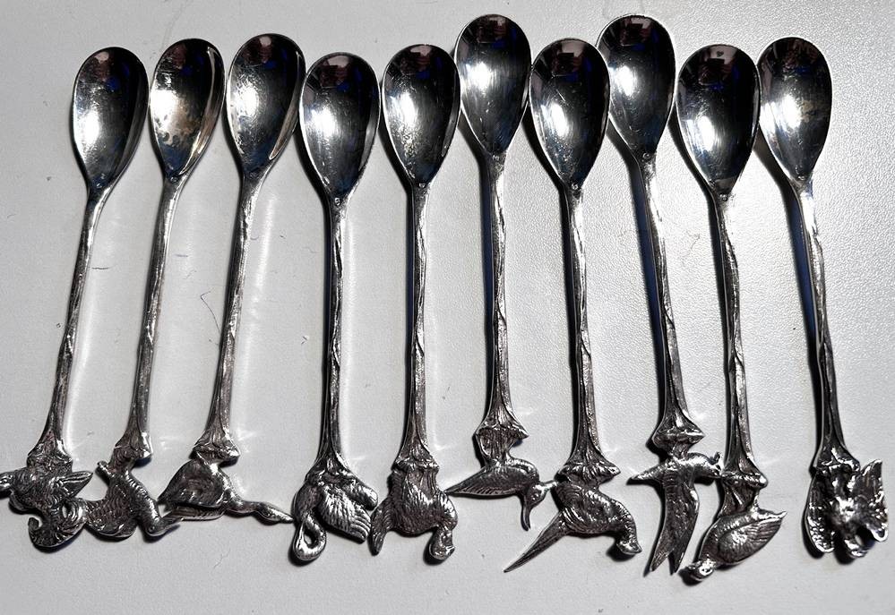 10x Silber Kaffeelöffel, Griffende mit Wildvögel, ungedeutete Punzen in Laffe, L-12,5 cm, ca. 160 gr.