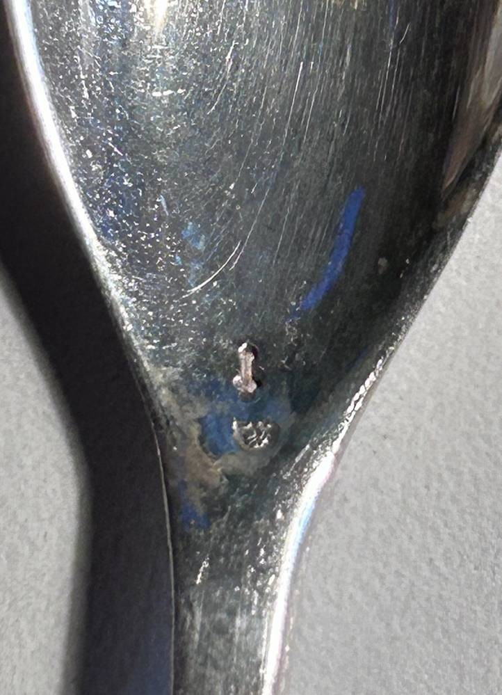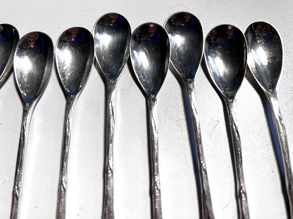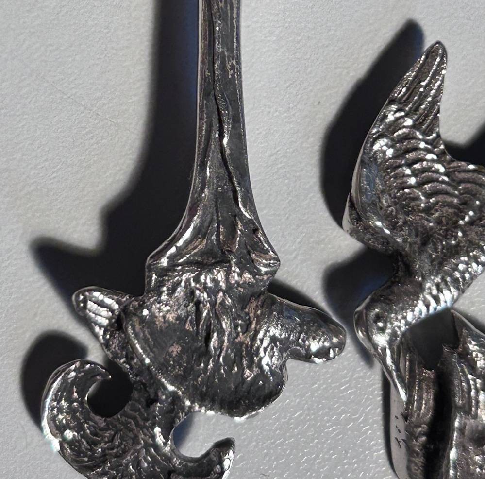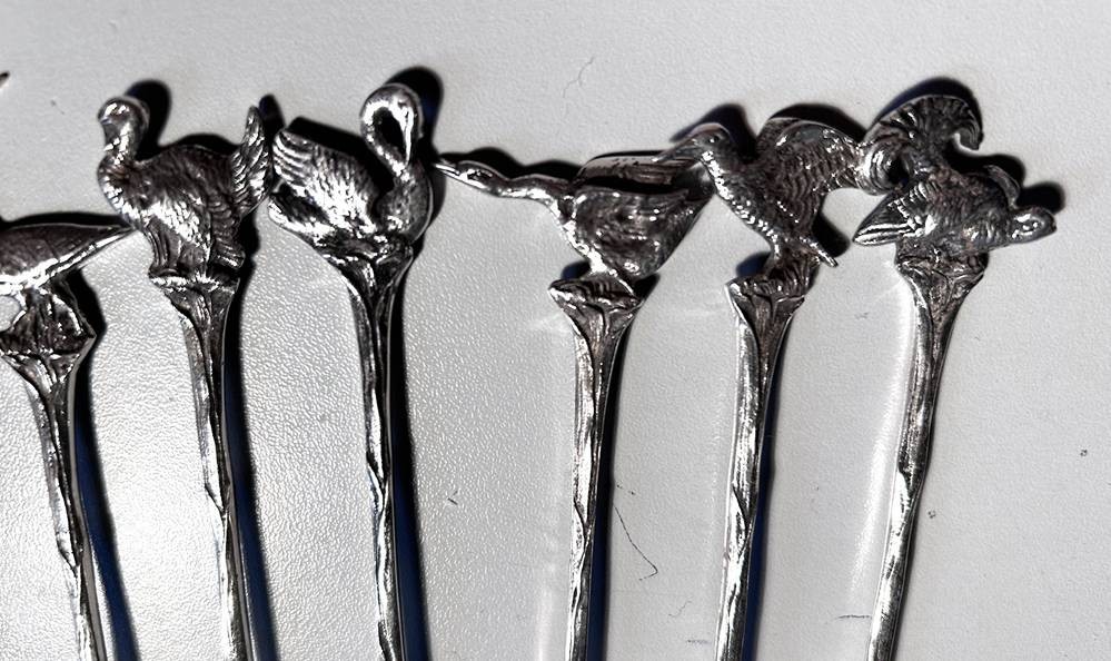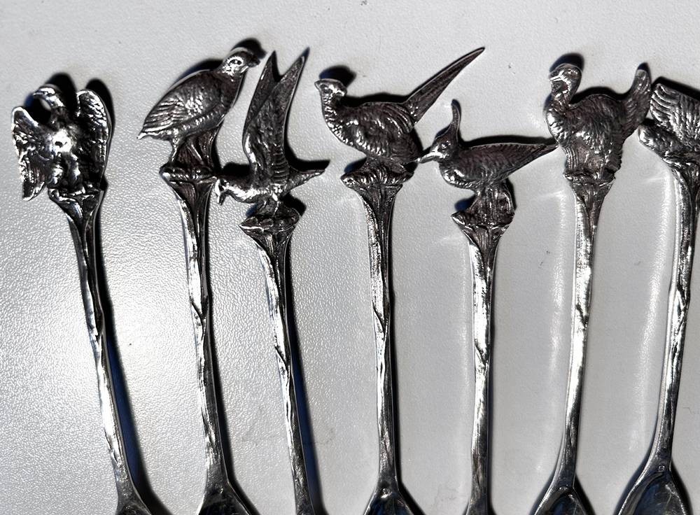 10x Silber Kaffeelöffel, Griffende mit Wildvögel, ungedeutete Punzen in Laffe, L-12,5 cm, ca. 160 gr. [1]