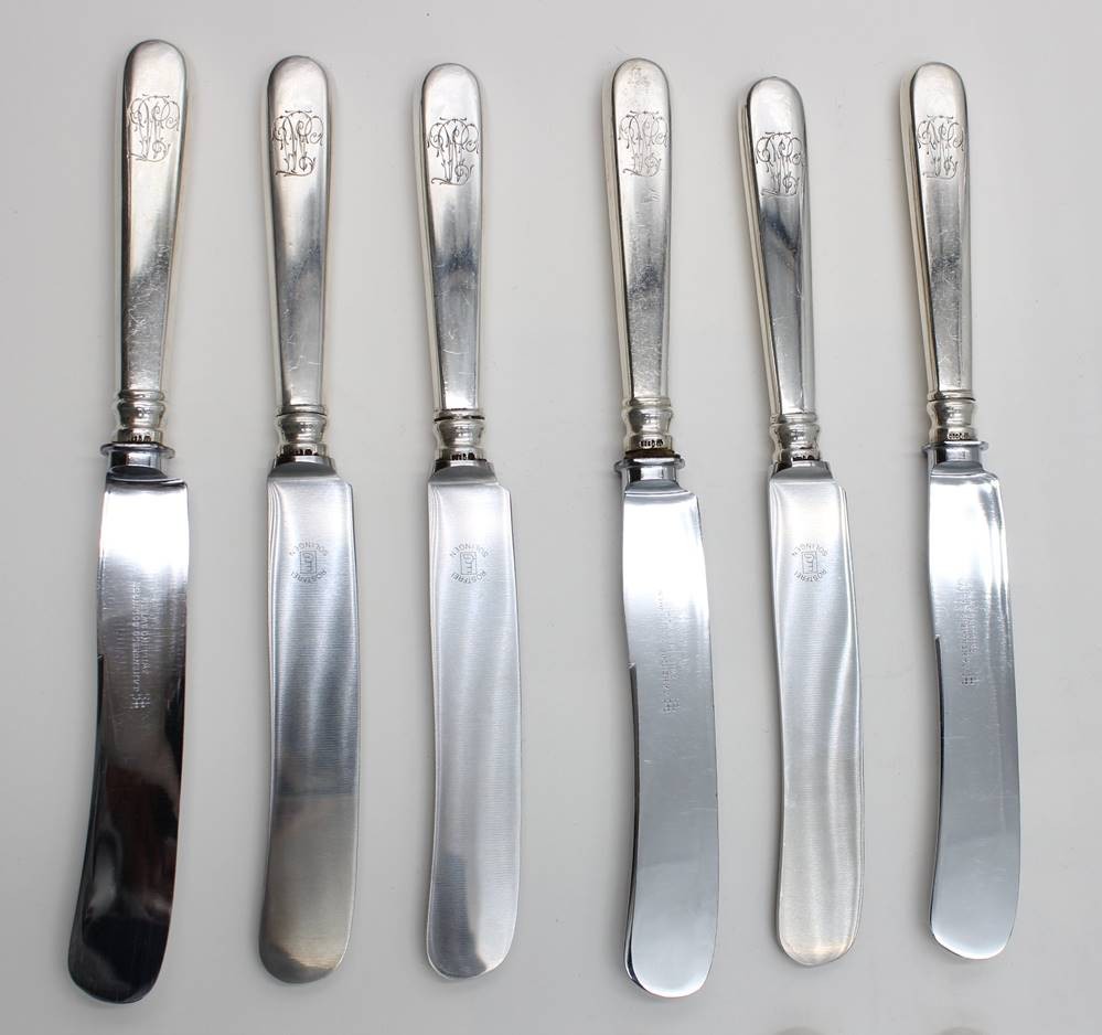 12 alte Messer mit Silbergriffen-900-, Ziermonogramm, zus. ca. 1050 gr., L-ca. 24 cm, in roten Rolltuch [1]