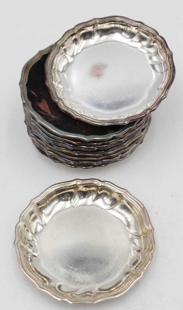 12 versilberte Glasuntersetzer, alle gleiches Design jedoch unterschiedliche Hersteller , Cohr - Prima u. Atla gemarkt . D-8cm