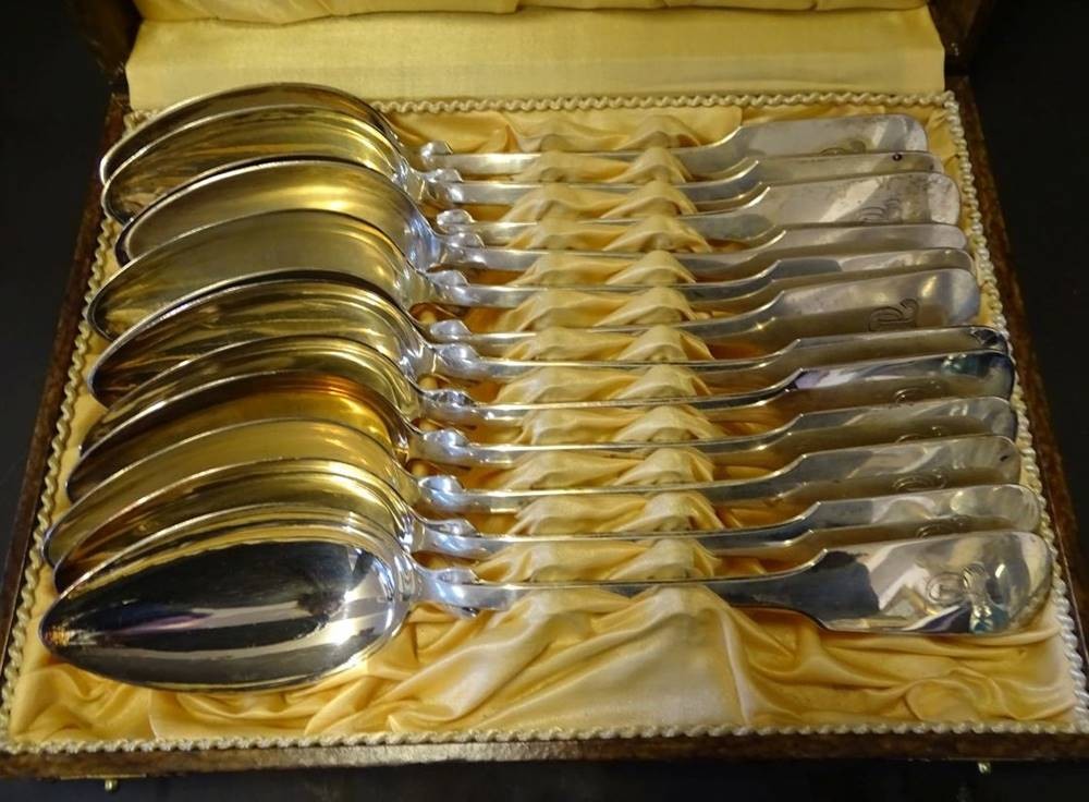 12x gr. Silberlöffel-800-, Ziermonogramm DL, Spatenform, sehr gut erhalten, L-22 cm, zus. 780 gr. [1]