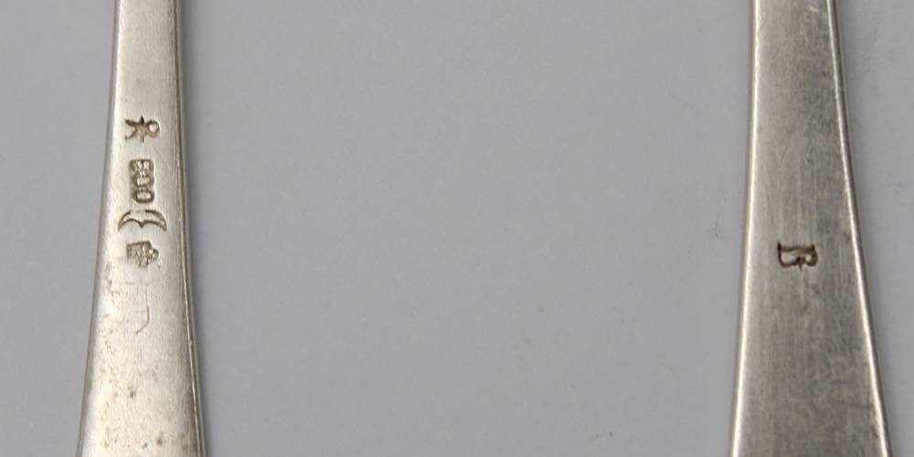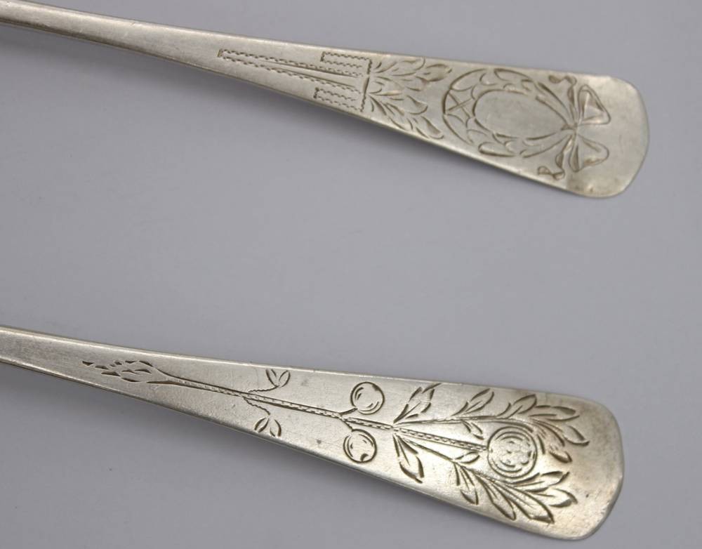 2x antike Kaffeelöffel, Silber, Laffen mit Druckstellen, je ziseliert, zus. ca. 45,6gr., L-ca. 17cm [1]