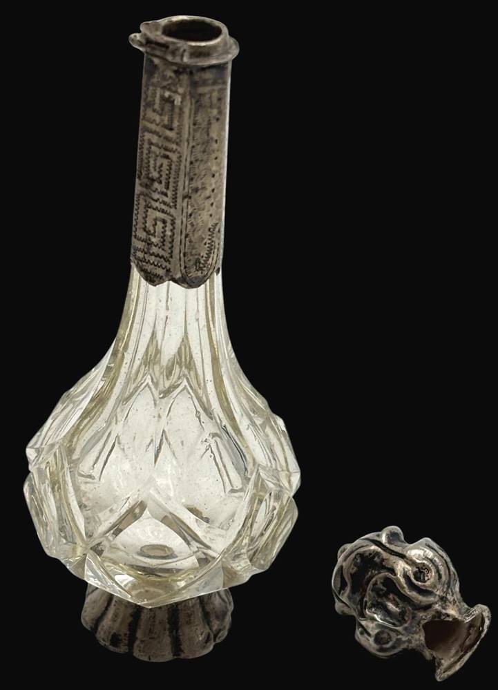 2x Kristall-Flacons mit Silbermontur, beide 18/19.Jhd, 1x Deckel lose, H-ca. 11 cm [1]