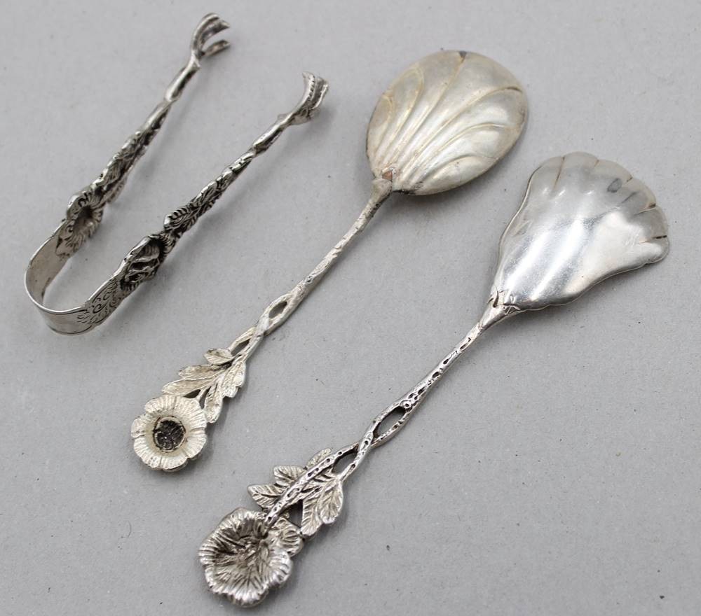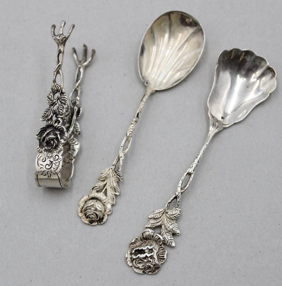 3 Teile Rosenmuster, 800/835er Silber, Sahnelöffel, Zuckerschaufel und Zuckerzange, zus. 39,2gr., ca. L-12cm [1]
