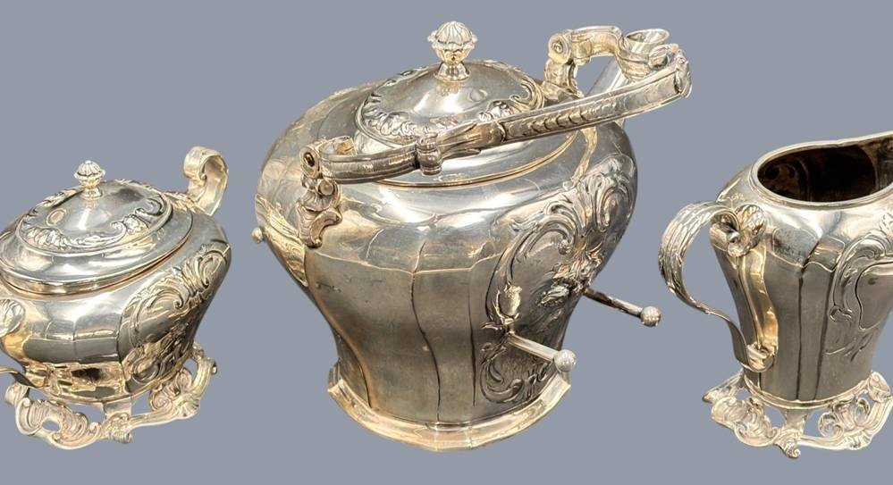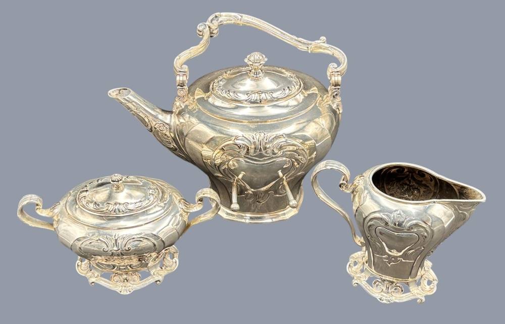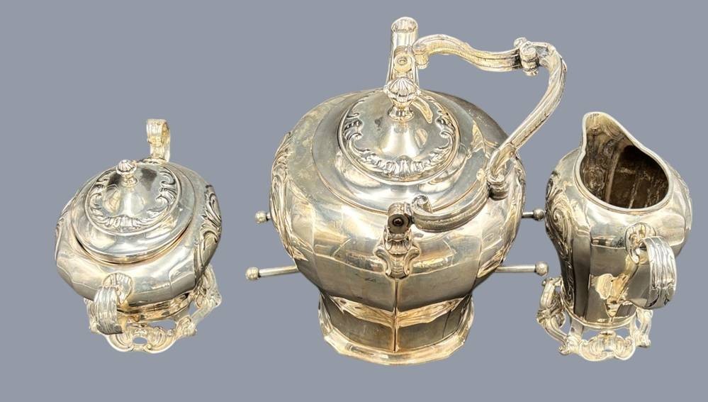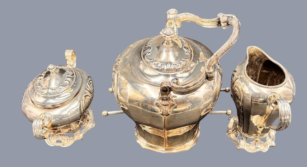 3 tg. grosser Teekern, plated, gut erhalten "Art-Krupp" Berndorf, Kanne (2,2L) mit Henkel H-28 cm, Rechaud fehlt, massive Ausführung [1]