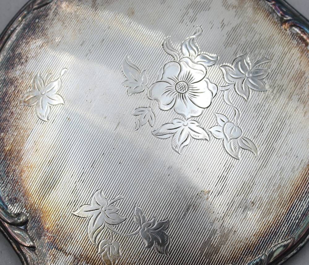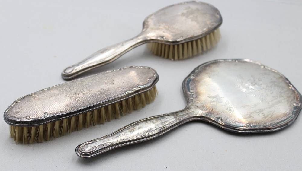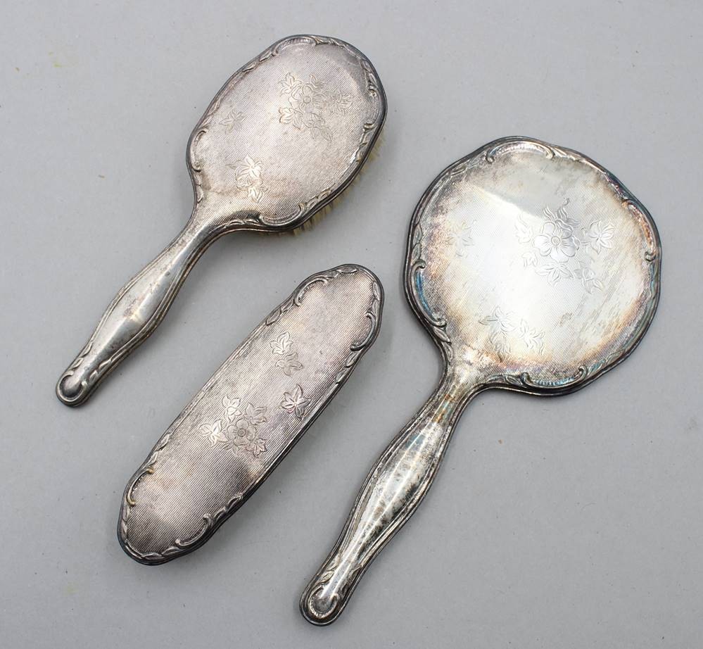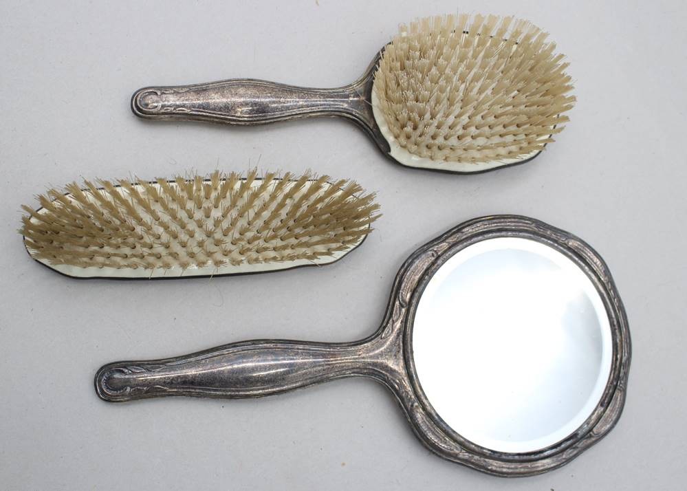3tlg. Friesierset, versilbert, Handspiegel mit Druckstelle und Füllung gebrochen, ca. L-28,5cm [1]