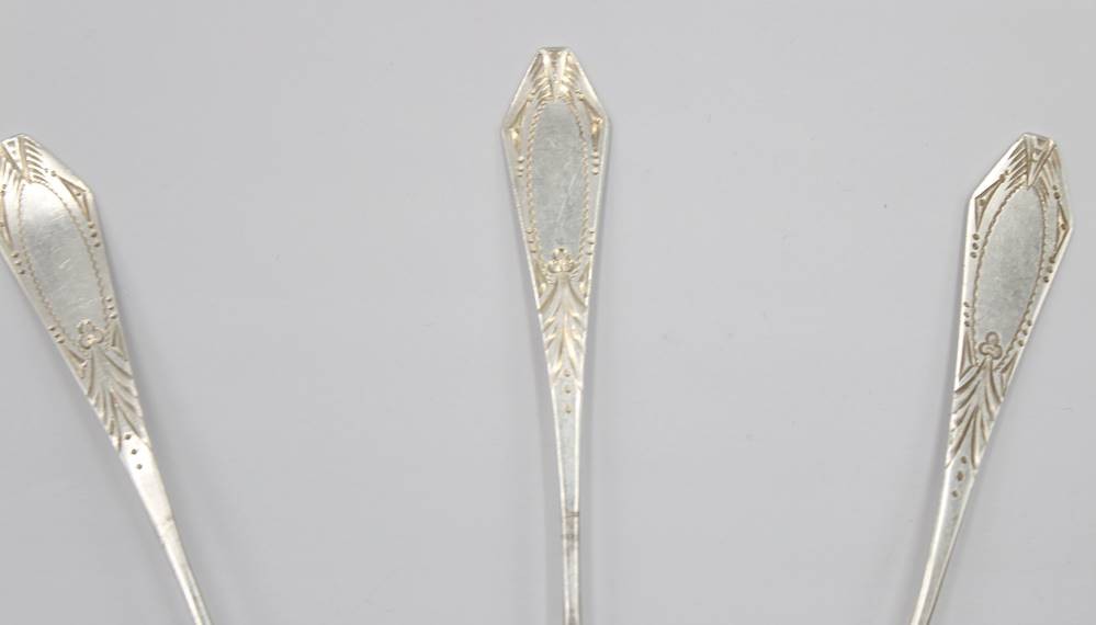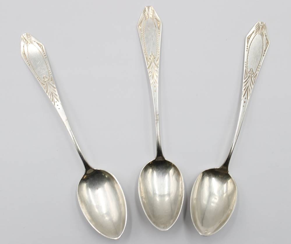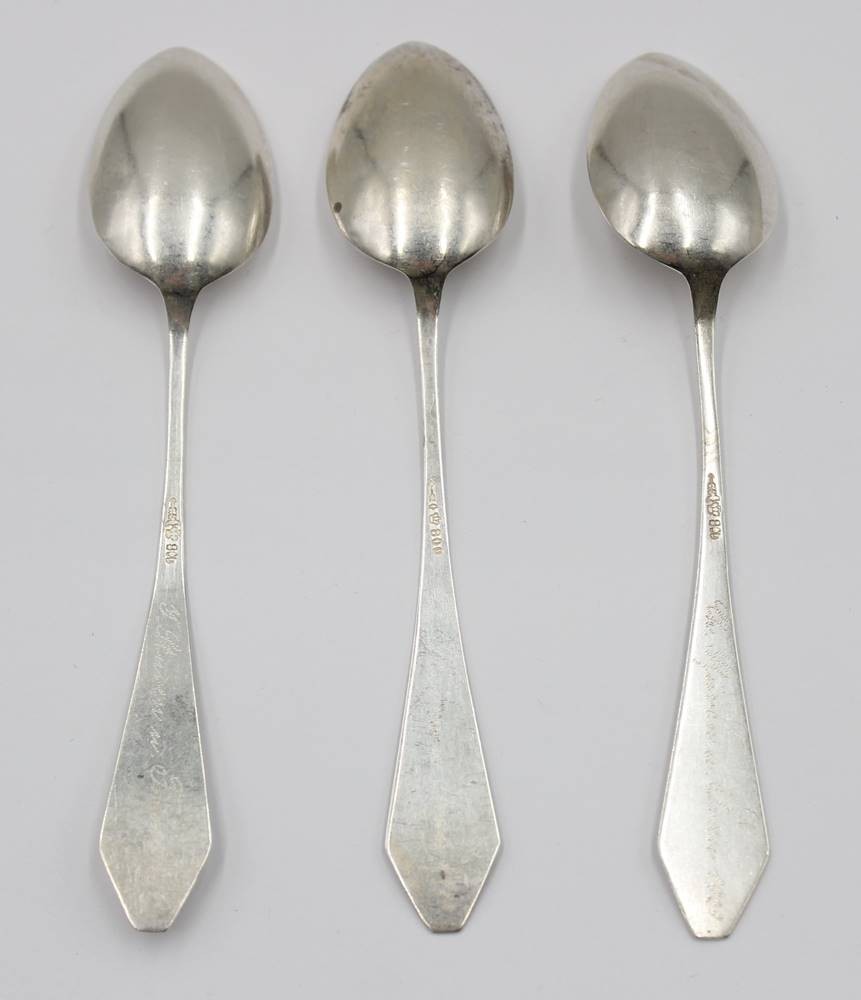 3x 800er Silber-Kaffeelöffel, Art-Déco, verso Namensgravur und datiert 1929, 28,8gr., L-13cm