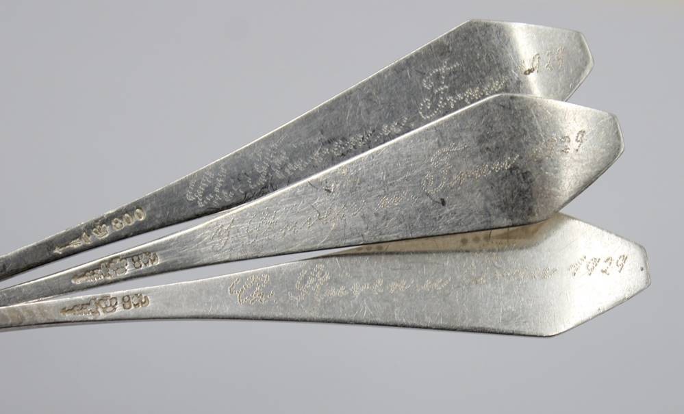 3x 800er Silber-Kaffeelöffel, Art-Déco, verso Namensgravur und datiert 1929, 28,8gr., L-13cm [1]