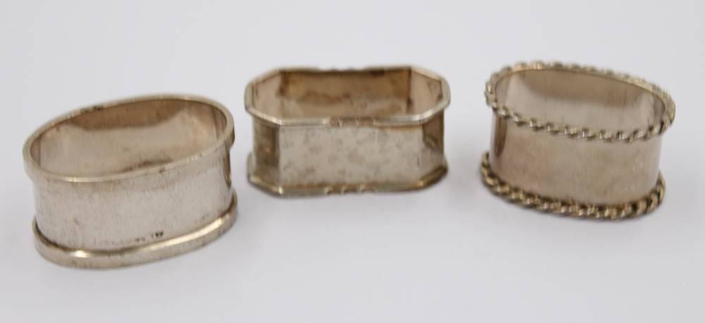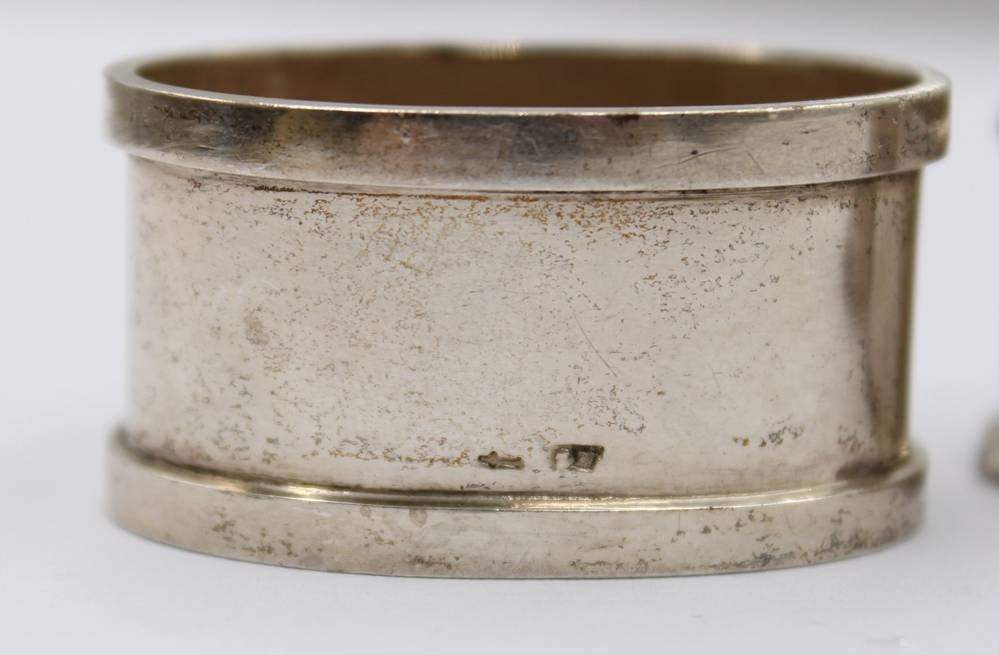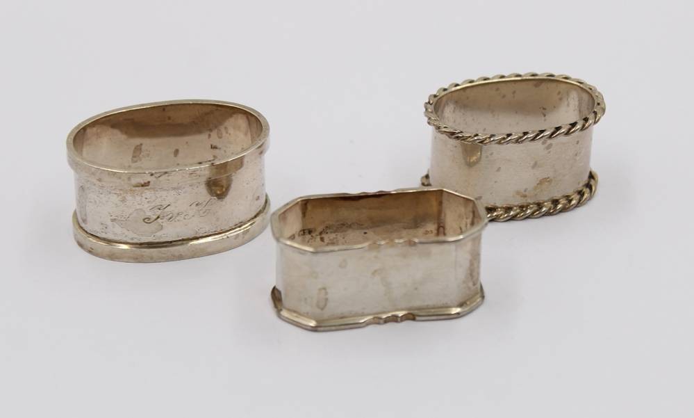 3x div. kl. Serviettenringe, Silber gepr., Pfeilpunze?, 1x Ziermonogramm, zus. 31gr., ca. B-3,7cm [1]