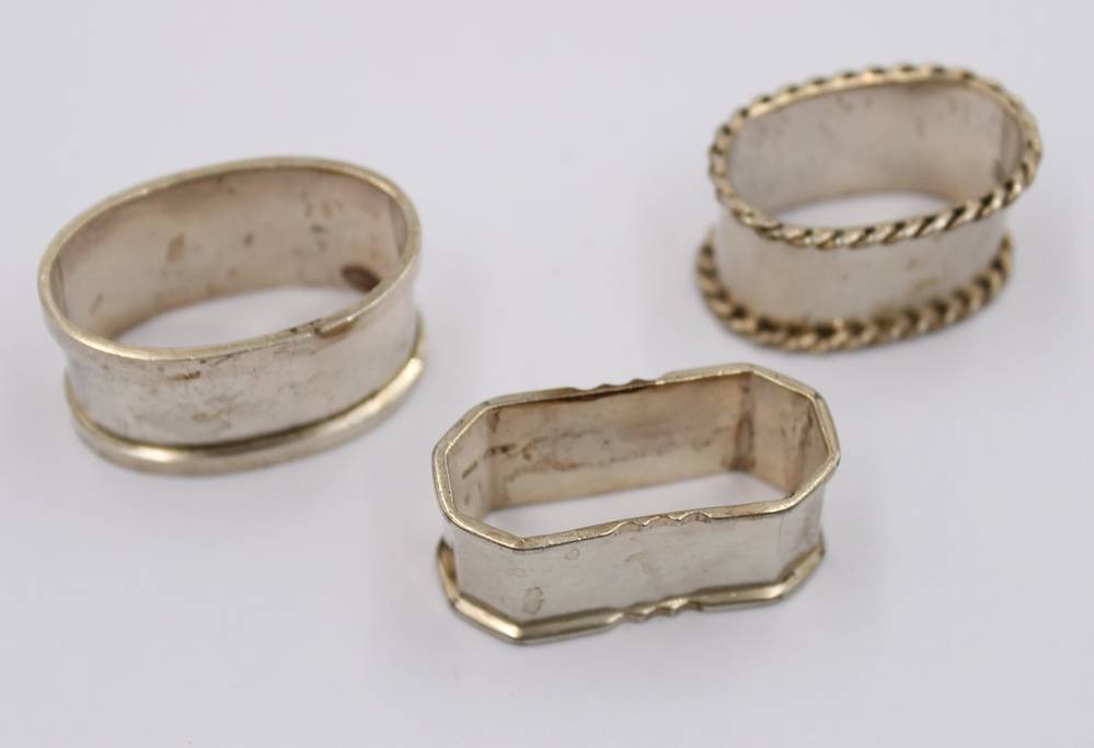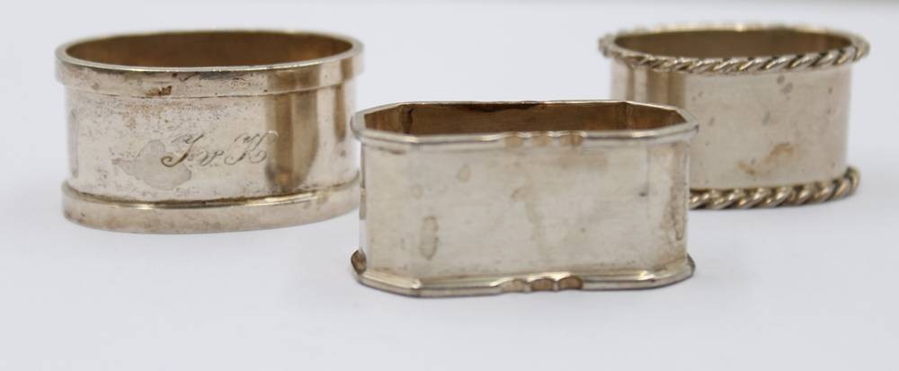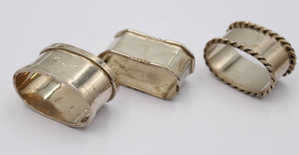 3x div. kl. Serviettenringe, Silber gepr., Pfeilpunze?, 1x Ziermonogramm, zus. 31gr., ca. B-3,7cm