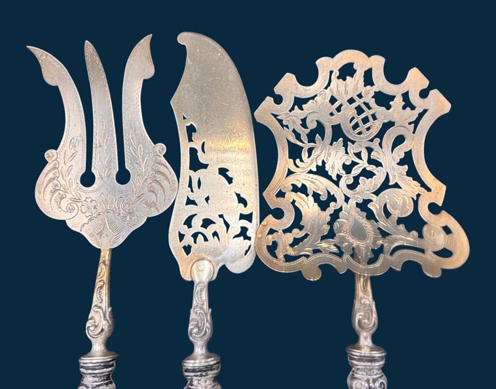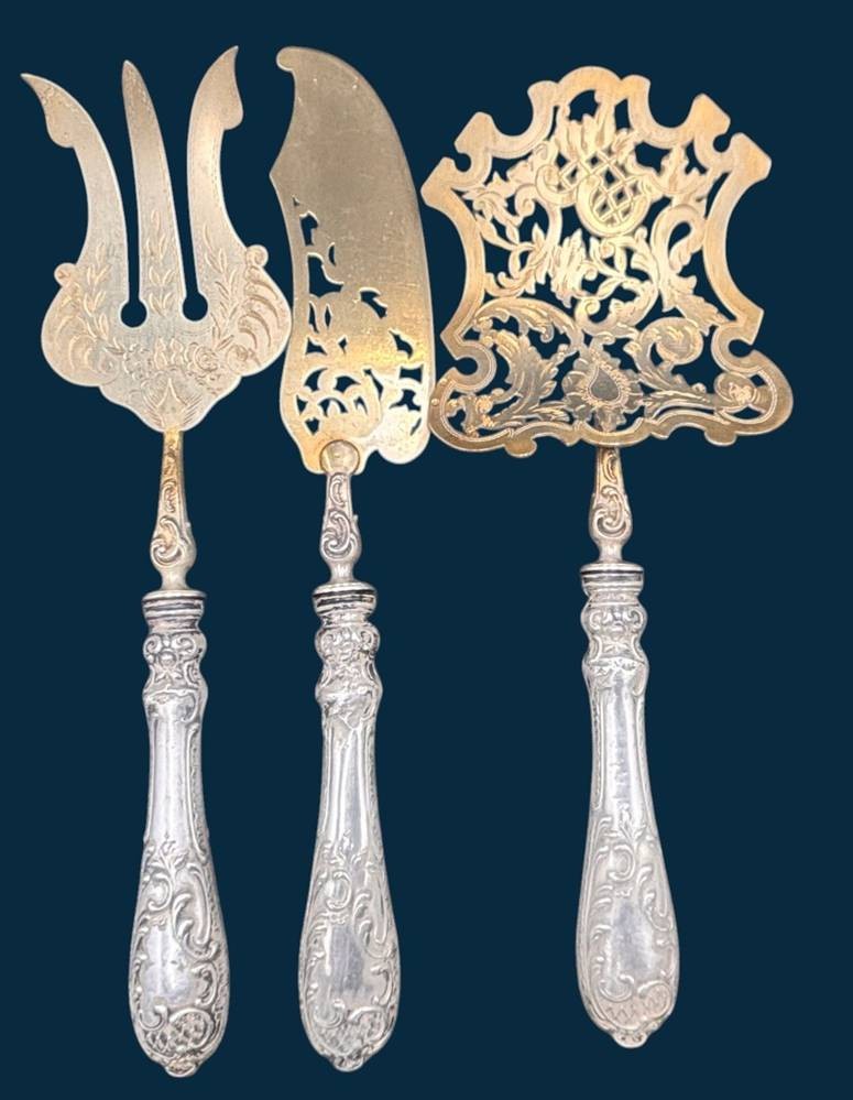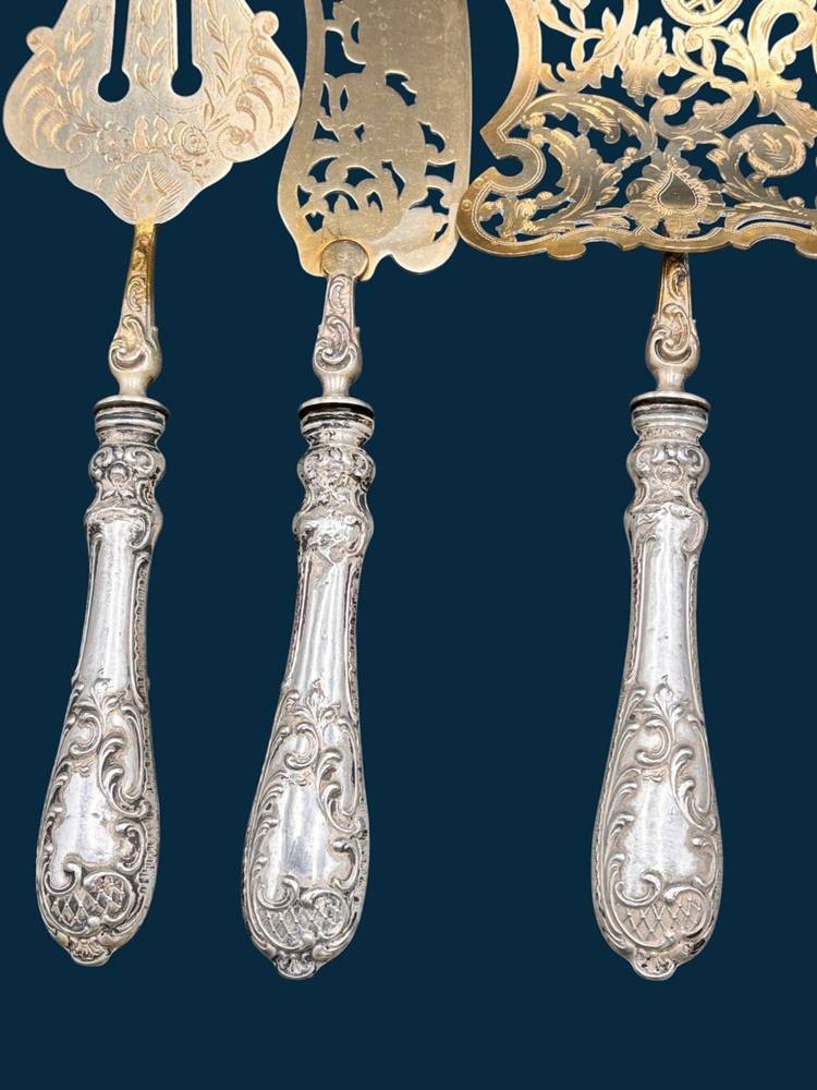 3x gr. Fisch-Vorlegeteile mit Silbergriffen, Heber etc. alle vergoldet, L-ca. 28 cm, zusammen 330 gr [1]