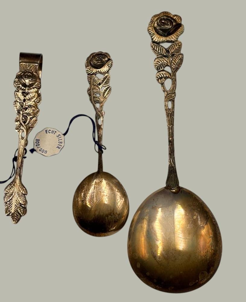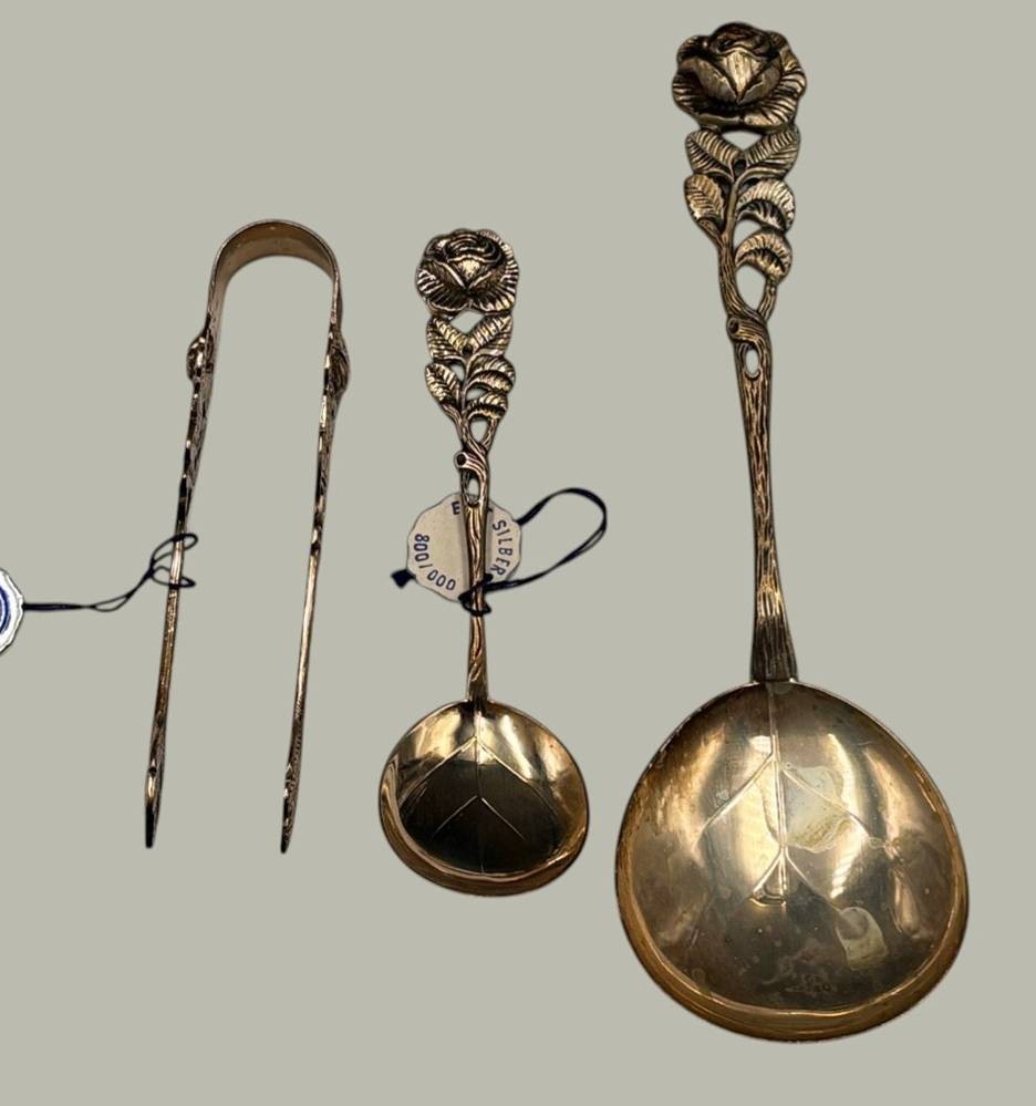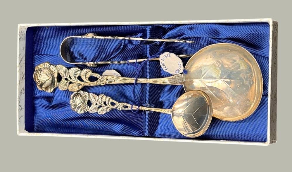3x Kaffeebesteck "Antiko" Silber-800-, Zuckerzange, Sahne-und Zuckerlöffel, Rosenmuster, in OVP , zus. 66 gr., wohl unbenutzt, 2x orig. Etiketten [1]
