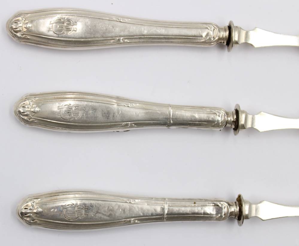 3x Silber-800- Fischgabeln, Ziermonogramm, Gebrauchsspuren, L-20 cm, zus. ca. 137 gr. [1]