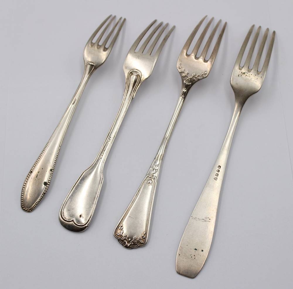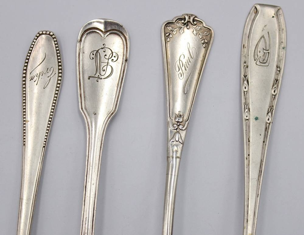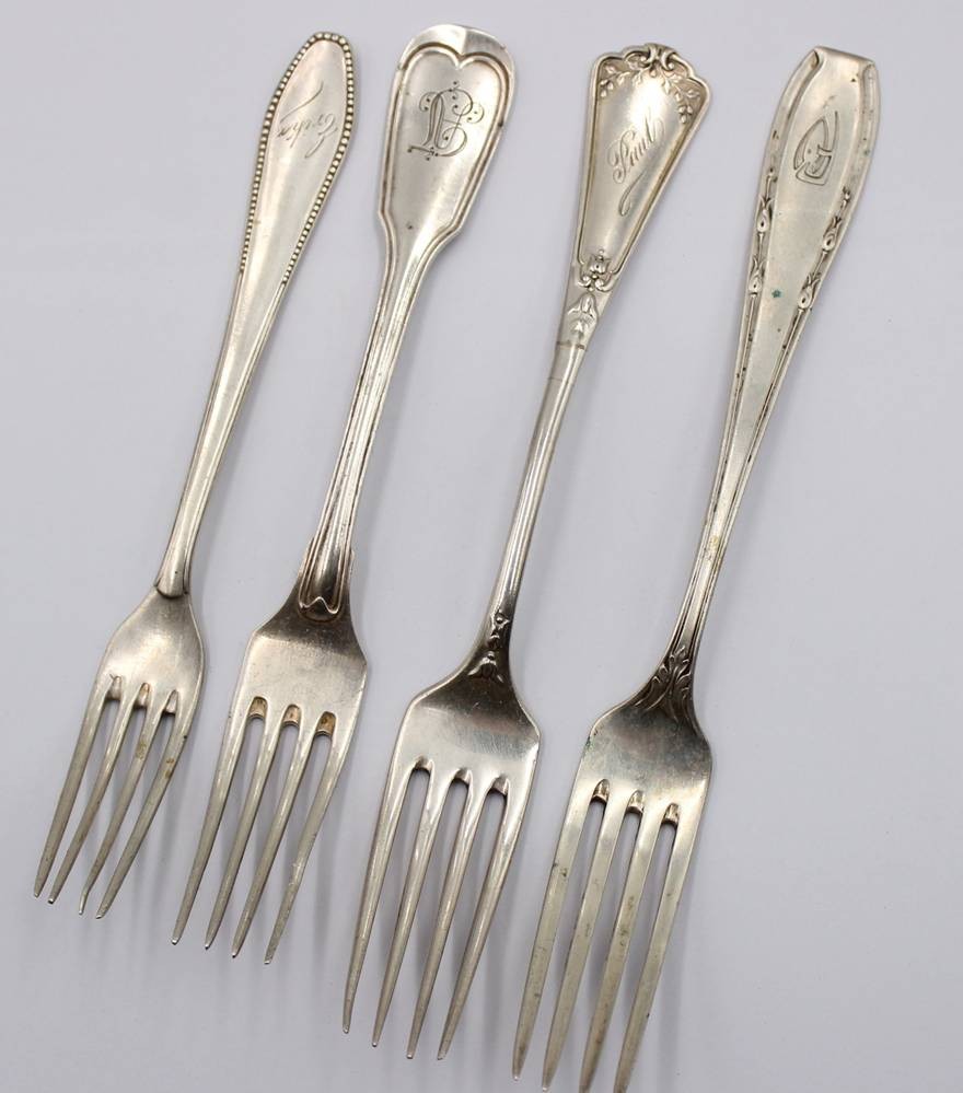 4x ältere Silber-Gabeln, je mit Monogramm, 3x 800er, 1x ungepunzt, zus. 217gr., L-21,3cm
